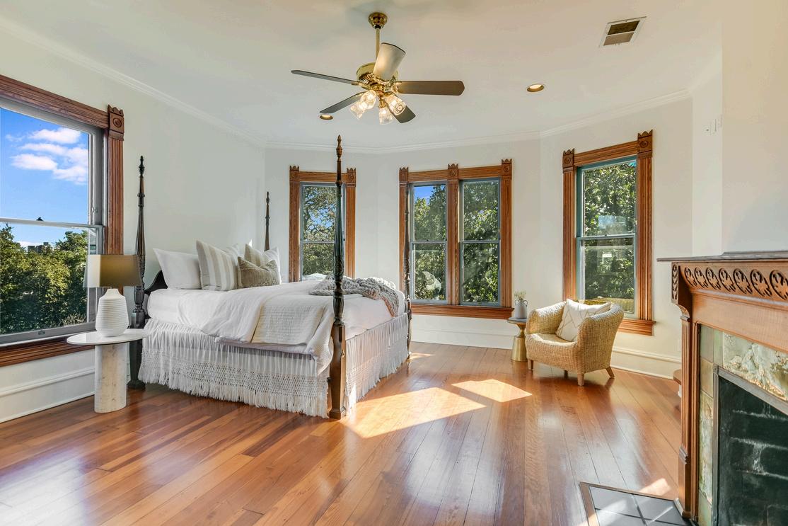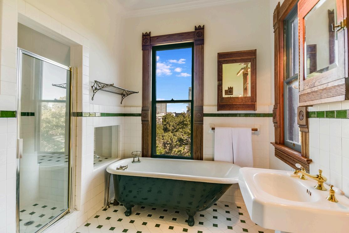 The primary bathroom retains its original clawfoot tub and pedestal sink, beautifully restored to reflect the luxurious sensibilities of the home’s original design - all while featuring breathtaking downtown views. An original door leads you to your very own private porch.