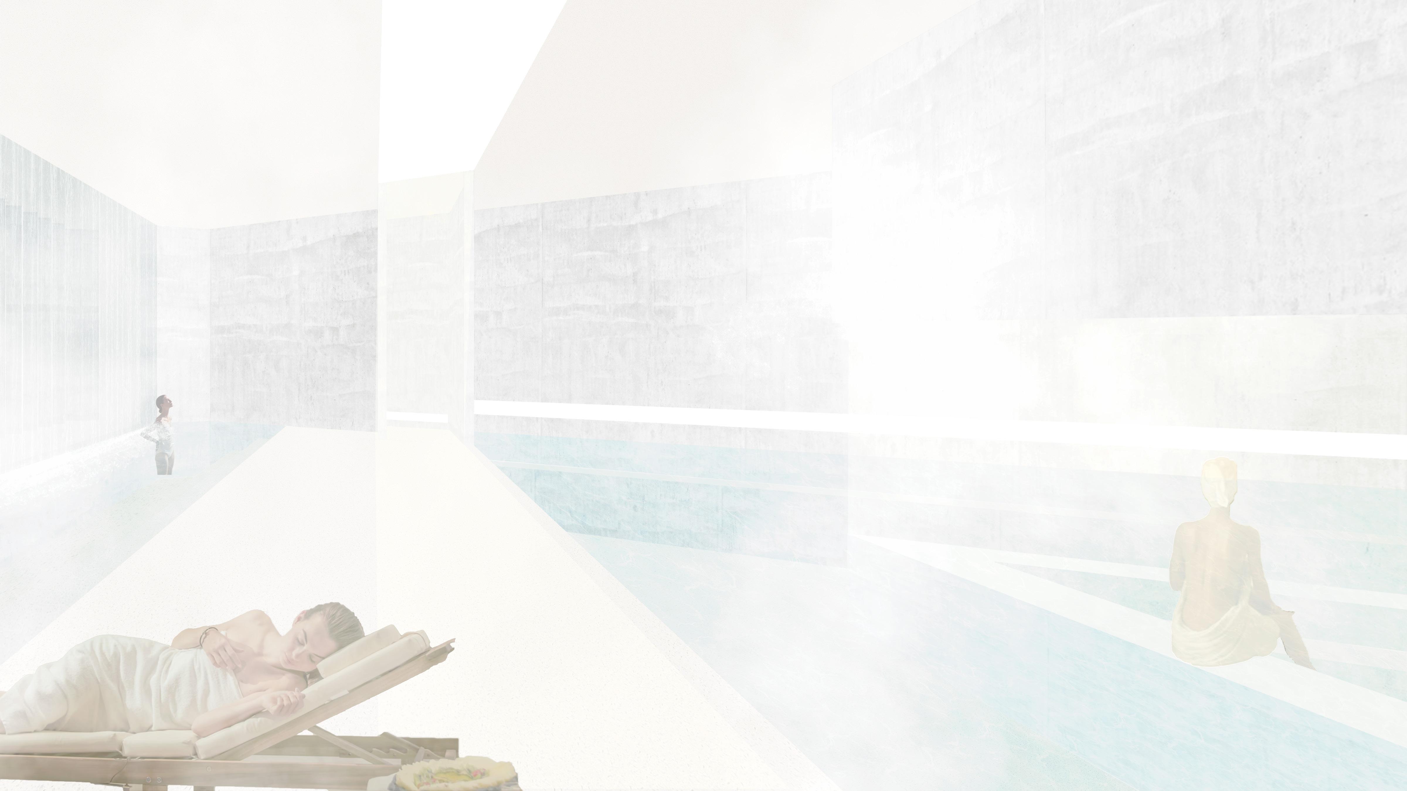 the goal is to build a wellness center as an addition to princeton university’s dillon gym in new jersey. we were tasked to design "inside out", where the feeling and experience in the space are prioritized. my approach is to focus on what makes me feel relaxed and satisfied. to achieve my goal, i applied patterns that arise from nature, such as the reflection of water on an opaque surface, and visual rhythms, like the colonnade elements and elevation variations. since i connect water with relaxation, i applied it extensively hugging the various spaces i created, where an oasis on the campus was born. my design was heavily influenced by tadao ando's works; using concrete as the main material and minimalist design, in which the light determines the type of space and tells directions. specifically, the path to the meditation gardens at the chichu museum and the langen foundation for the student center.