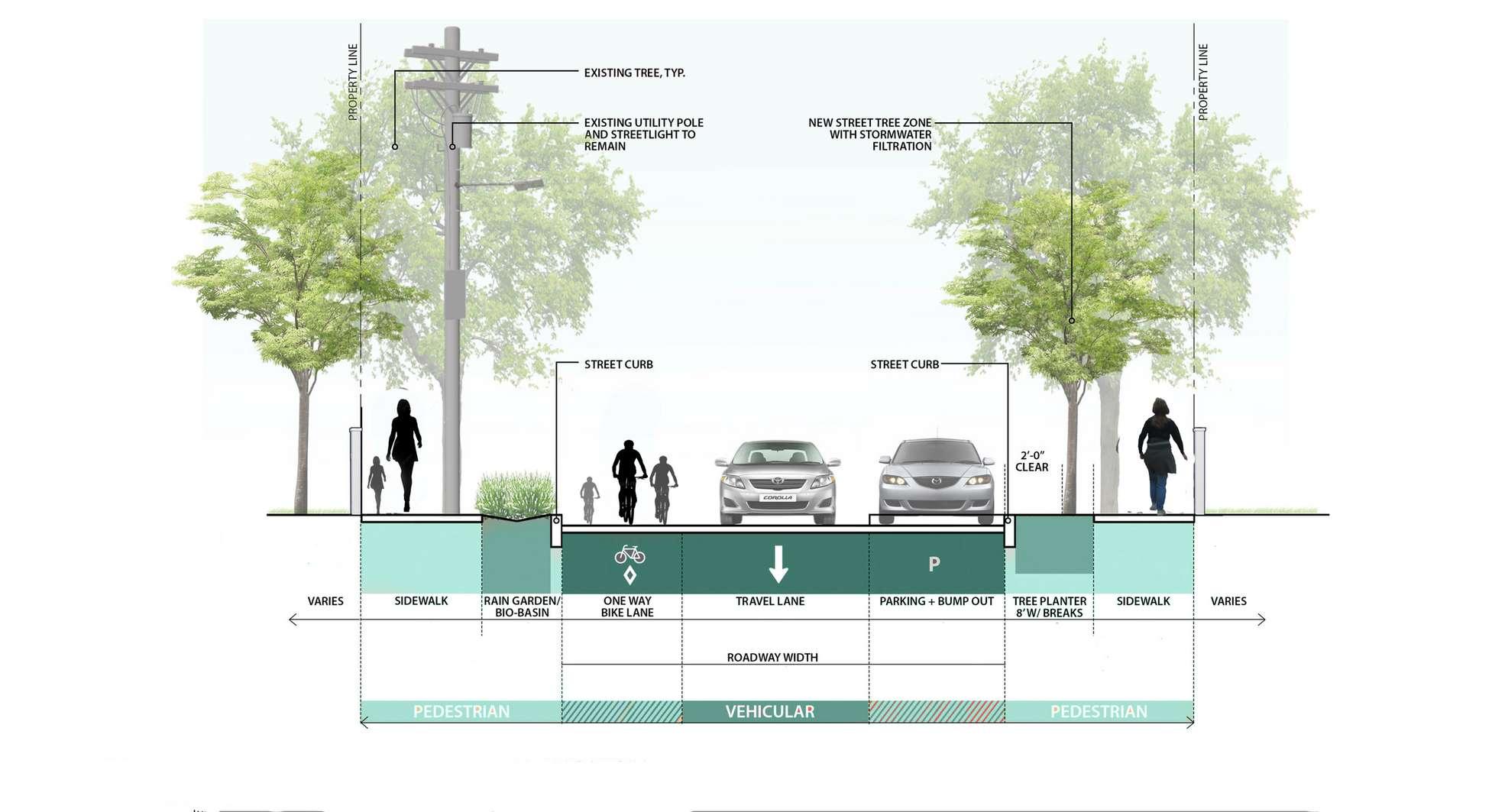 Three surface ideas with options for one- and two-way vehicle traffic, enlarged sidewalks, bike accommodations, more street trees, and stormwater mitigation interventions including bioswales and permeable paving were developed after a series of community events meant to solicit feedback.