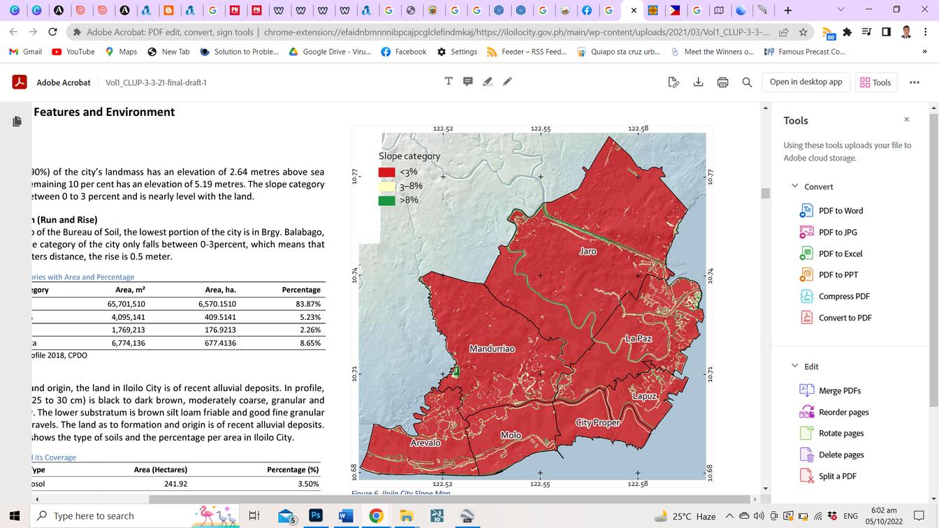 Ninety percent (90%) of the city’s landmass has an elevation of 2.64 metres above sea level, while the remaining 10 per cent has an elevation of 5.19 metres. The slope category of the city falls between 0 to 3 percent and is nearly level with the land. Slope Description (Run and Rise) Based on the map of the Bureau of Soil, the lowest portion of the city is in Brgy. Balabago, Jaro district. Slope category of the city only falls between 0 3percent, which means that for every 100 meters distance, the rise is 0.5 meter.