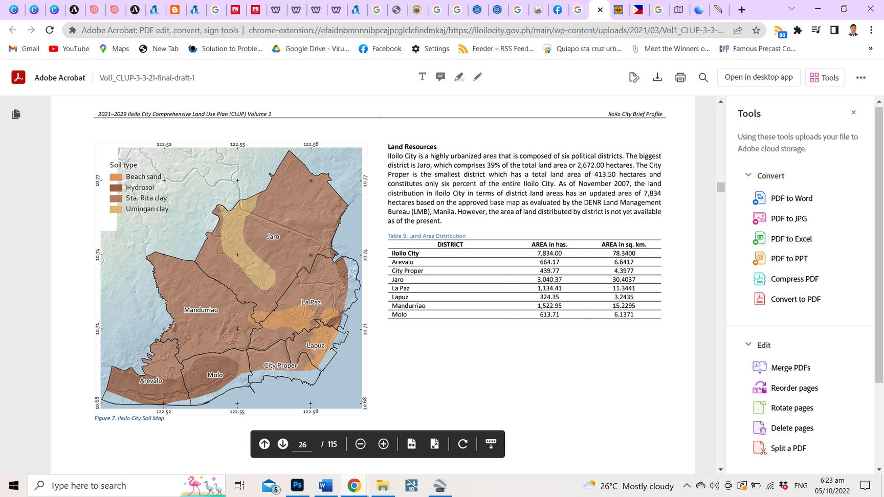 Iloilo City is a highly urbanized area that is composed of six political districts. The biggest district is Jaro, which comprises 39% of the total land area or 2,672.00 hectares. The City Proper is the smallest district which has a total land area of 413.50 hectares and constitutes only six percent of the entire Iloilo City. As of November 2007, the land distribution in Iloilo City in terms of district land areas has an updated area of 7,834 hectares based on the approved base map as evaluated by the DENR Land Management Bureau (LMB), Manila. However, the area of land distributed by district is not yet available as of the present.