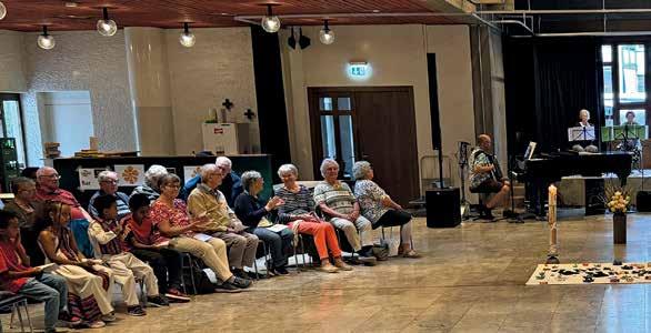 Nachdem der St. Urban-Chor dieses Jubiläum bereits im 2022 feiern durfte, kommt nun auch die Pfarrei St. Urban in den Genuss dieses Ereignisses. 50 Jahre St. Urban, das muss gefeiert werden. Just nach den Sommerferien ist es so weit. Nach dem Familien-Gottesdienst und anschliessendem Picknick am Freitagabend, steigt das grosse Fest so richtig am Samstag. Punkt 13.00 Uhr begrüsst Gemeindeleiter Peter Koller – in voller Hippie-Kluft der 70er Jahre, inkl. Plateauschuhe, die allein schon eine Herausforderung sind – die zahlreichen Gäste im Foyer von St. Urban und lädt ein zum Apéro. Eine feine, frische Früchtebowle mit vielen, liebevoll von Helfershänden zubereiteten Häppchen erwarten die Anwesenden. Welche Wohltat, da auch Petrus sich mit seinem