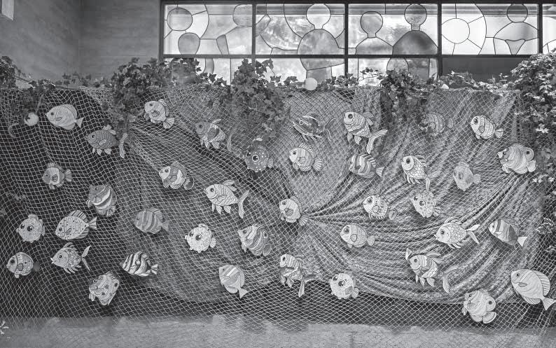 Titelbild: Die Erstkommunikantenkinder waren dieses Jahr zusammen als Fische in einem Schwarm unterwegs. Jeder Fisch einzeln mit Namen, aber aus der Ferne als Gemeinschaft erkennbar.