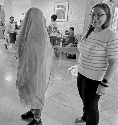 hatten, die ihnen buchstäblich auf den Leib geschrieben war. Astrid Knipping als Diva in einem Kleid, das jedes Model vor Neid erblassen lässt. Gerda Wyss als Rezeptionistin Jeanine, die stets auf den guten Ruf des Hauses bedacht ist und um jeden Preis alles unter Kontrolle haben möchte. Unser Peter Koller als DauerVerliebter Egon Röösli in farbenfrohen Kleidern. Joachim Seefelder als HotelPage allzeit dienstbereit. Varghese Nadackal als glaubwürdiger Pater Don Camillo. Catia Selvan, unsere neue Pfarreisekretärin, hat ihren Platz als abergläubige Esmeralda perfekt in den Reihen des Teams eingenommen. Sonja Calmbach blühte als Verlobte von Egon Röösli mit selbstaufgestecktem Verlobungsring sichtlich auf. Armin
