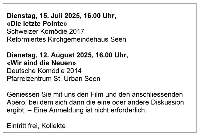 Di 12.8.25 16.00 Seemer Bildungsreihe «Wir sind die Neuen» Pfarreizentrum St. Urban, siehe Seite 32