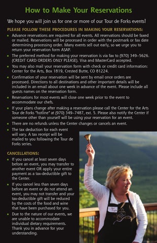How to Make Your Reservations We hope you will join us for one or more of our Tour de Forks events! PLEASE FOLLOW THESE PROCEDURES IN MAKING YOUR RESERVATIONS: n Advance reservations are required for all events. All reservations should be faxed or mailed. Reservations will be processed in order with the postmark or fax date determining processing order. Many events sell out early, so we urge you to return your reservation form ASAP. n The preferred method for making your reservation is via fax to (970) 349–5626. (CREDIT CARD ORDERS ONLY PLEASE). Visa and MasterCard accepted. n You may also mail your reservation form with check or credit card information: Center for the Arts, Box 1819, Crested Butte, CO 81224. n Confirmation of your reservation will be sent by email once orders are processed. Directions to all destinations and other important details will be included in an email about one week in advance of the event. Please include all guests names on the reservation form. n Reservations for most events will close one week prior to the event to accommodate our chefs. n If your plans change after making a reservation please call the Center for the Arts Tour de Forks “hotline” at (970) 349–7487, ext. 5. Please also notify the Center if someone other than yourself will be using your reservation for an event. n There are no refunds unless the Center changes or cancels an event. n The tax deduction for each event will vary. A tax receipt will be mailed to you following the Tour de Forks series. CANCELLATIONS: n If you cancel at least seven days before an event, you may transfer to another event OR apply your entire payment as a tax-deductible gift to the Center. n If you cancel less than seven days before an event or do not attend an event, you may not transfer and your tax-deductible gift will be reduced by the costs of the food and wine that have been purchased for you. n Due to the nature of our events, we are unable to accommodate individual dietary requirements. Thank you in advance for your understanding.