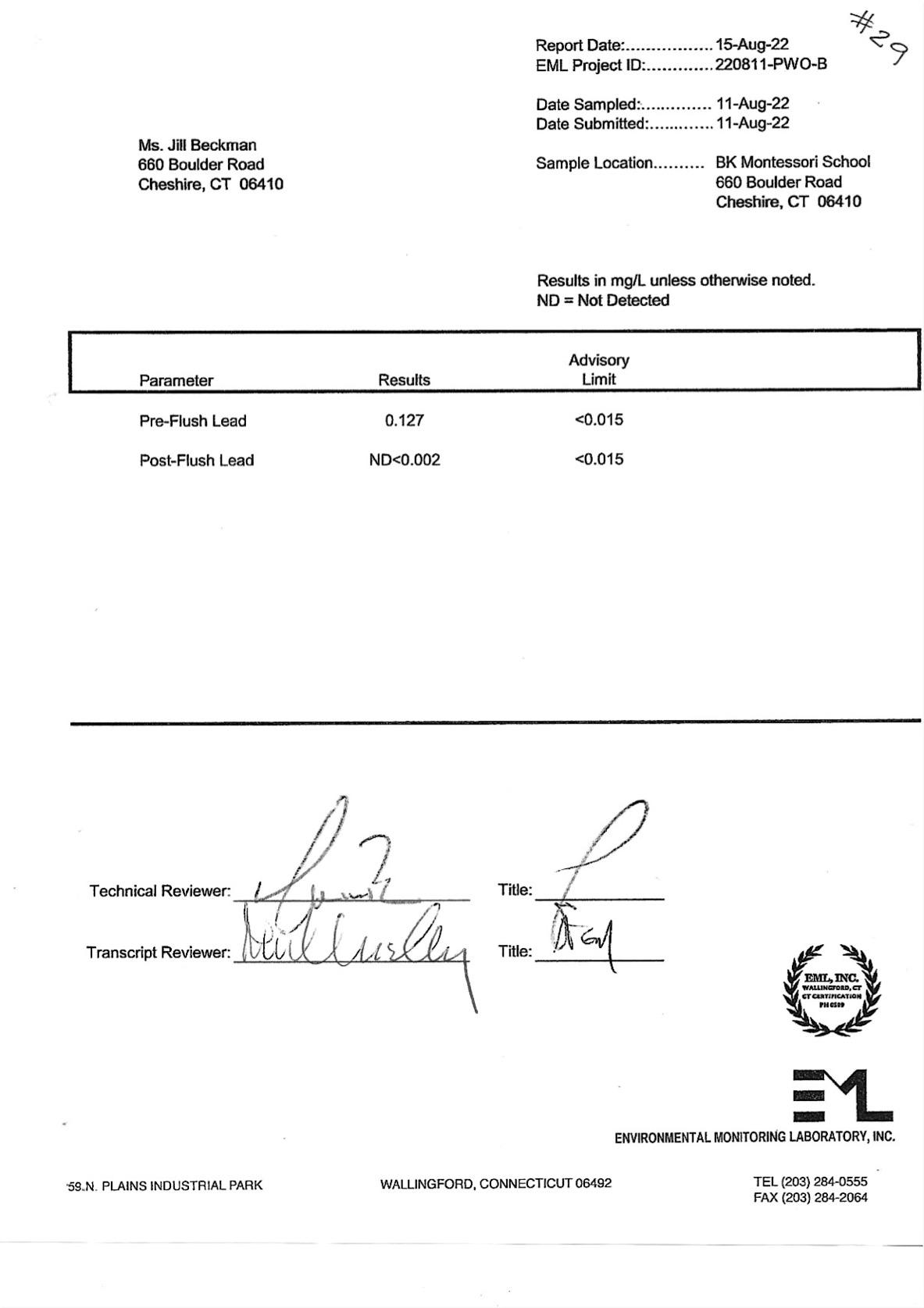 You can have your water tested at any State-certi ed water testing lab. A current list of certi ed labs can be obtained from the DPH Certi ed Environmental Labs (https://portal.ct.gov/DPH/Environmental-Health/Environmental-LaboratoryCerti cation/Environmental-Laboratory-Certi cation) website. Make sure the private lab is certi ed to test drinking water for the contaminants you are requesting. In most cases, you can collect a sample of your tap water yourself, although some labs may send a technician to collect a sample at your request. If you collect your own sample, carefully follow the laboratory's instructions to obtain a good sample. How to take a sample varies depending on the tests being performed. For example, some contaminants such as lead and copper may require that water remain stagnant in the pipes for a minimum of 6 hours and be collected upon the rst draw of water. Other contaminants require that the water be ushed or run for a minimum period of time before collecting the sample. Some contaminants require special sample bottles and procedures. Cleanliness is a must; make sure that nothing but the water comes in contact with the opening of the bottle or the inside of the cap. Timeliness is important, too. Some contaminants deteriorate or change form with time. Most water samples need to be kept cool when being taken to the lab. To assure accurate results, after collecting your water samples make certain the lab receives them within the speci ed time directed on the instructions.