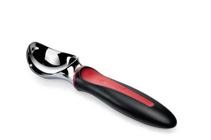 Sharply tapered scoop with zinc inner core cuts through the hardest ice cream.