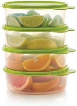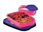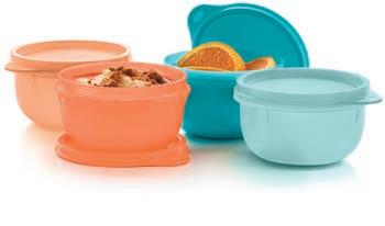 Accessories attach to liquid-tight seal. Includes 6⅓-cup/1.5 L bowl with seal, 2-oz./60 mL Tupper® Mini container, and snap-together fork and knife. 582 $22.00