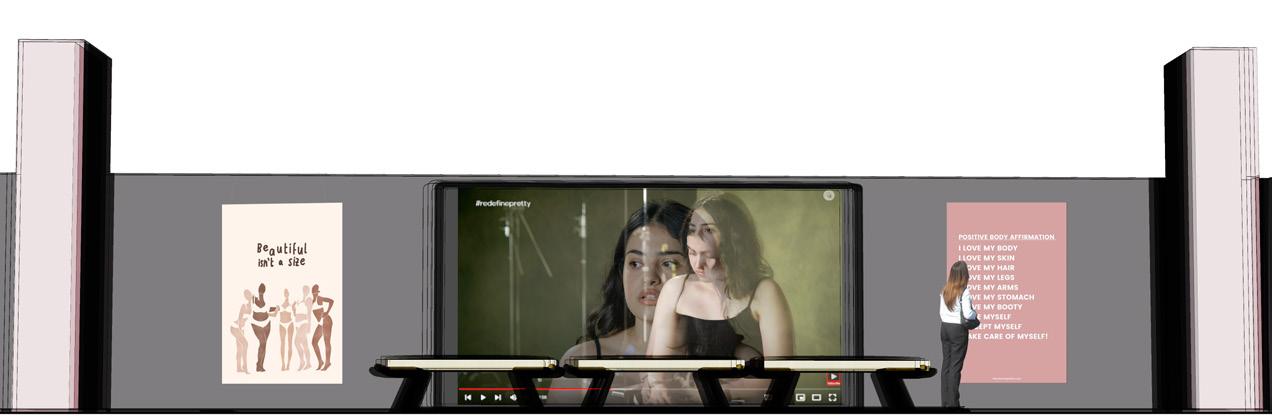 Inside the gallery, there is seating available to watch a video titled “Redefine Pretty.”