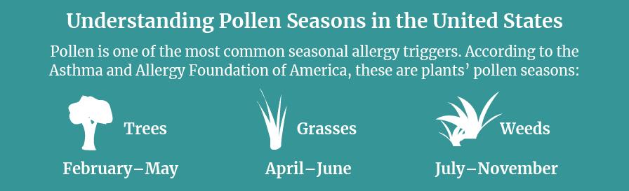 Pollen is one of the most common seasonal allergy triggers. According to the Asthma and Allergy Foundation of America, these are plants’ pollen seasons: