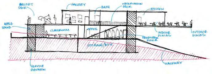 The intended project program was a cidery. Unaware of this process prior to the project, I thoroughly enjoyed researching its history and ties to the region. A big part of this programming was also community access. Classrooms and a gallery space were included in the design brief. I chose to emphasize these elements in my design, wanting to prioritize a space that would feel grounded in Mission Hill and a place residents could own as their own. Other than classroom and gallery space, the program called for a tasting area, production space, and restaurant. I began orienting my programming on site based on views and paths of egress. How would patrons and brewers move through this space? What equates a functional and experiential orientation? How can people feel involved in the creation of this cider?