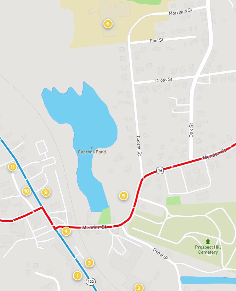 The land for Prospect Hill cemetery, next to St. Mary’s Parish was donated by Daniel Taft. It is one of the oldest cemeteries of the town and there are many historic gravestones. Some of the names that recur through Uxbridge’s history—Aldrich, Farnum, Taft, Wheelock, Capron, Willard, Chapin - are buried here. The map also identifies historic residences, most of which were built in between 1820 - 1880.