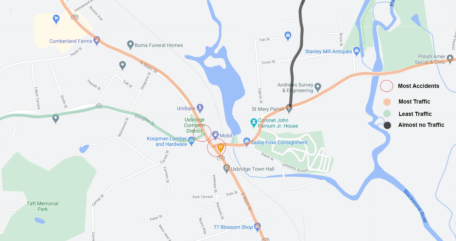 The Town of Uxbridge is one of the historic cities of the US with more than 375 National Historic Sites. Some of the most important issues as stated by the residents of the town are - ‘limited mobility access’, ‘transition to a destination economy’, ‘difficult Pedestrian and bicycle access’, and ‘repurposing of townowned properties. The main roads of the town route 16 and the main street are the busiest and the dangerous roads in the town. But there are a lot of historic landmarks and parks along these roads.