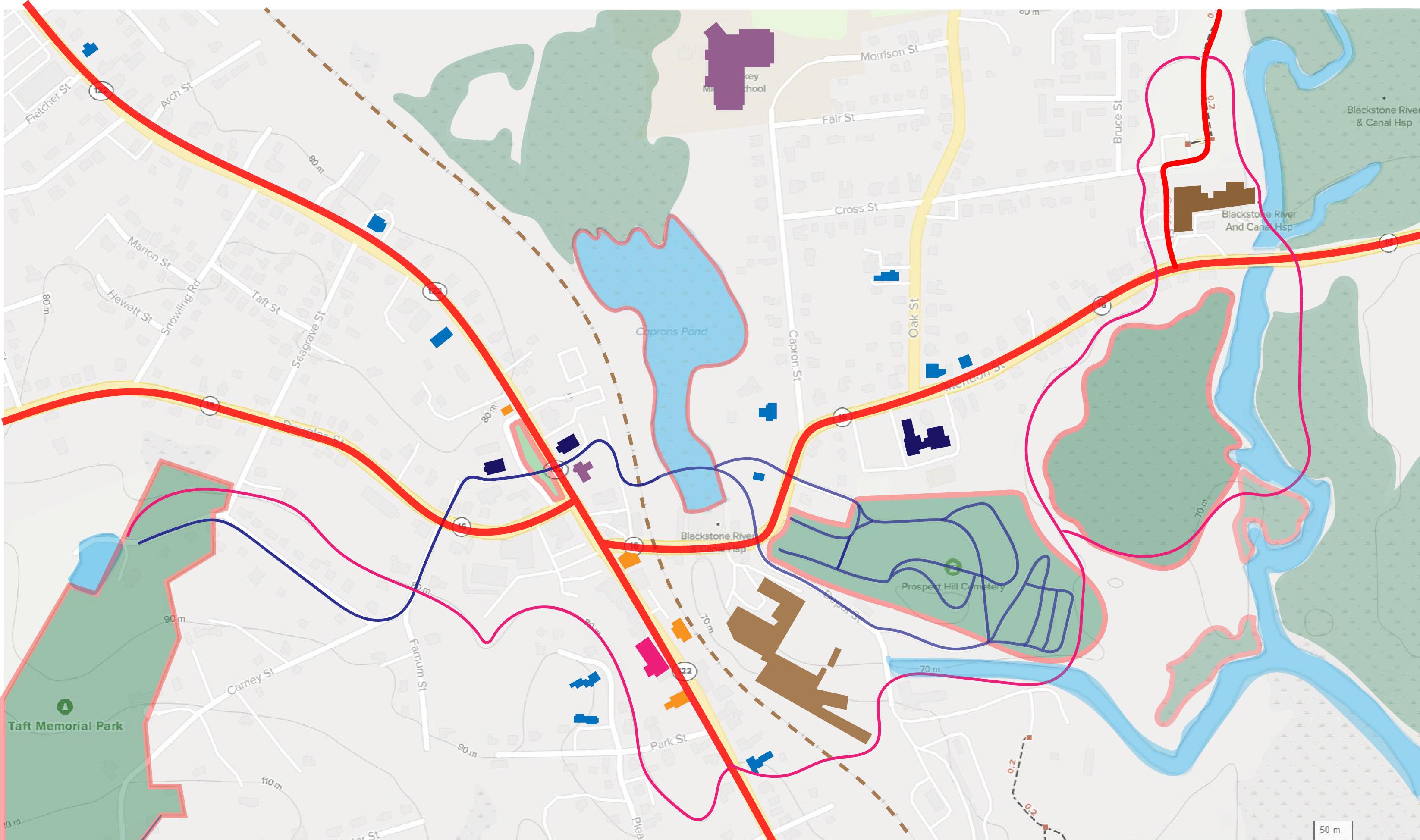 Currently,Mumford River and the pond right next to the downtown area are not actively being used by people even though there is a national heritage park right next to the bridge. Another problem is the park is partially not barrier-free when there is a large number of aged population in town. Therefore, create a walkway at the boundary of the pond to maximize the natural resource and increase the connectivity to the neighborhood while installing a barrier-free ramp where it is possible for the aged neighbors. Creating the grass parks along with the trail to encourage the people to enjoy the picnic or appreciate the environment of the surrounding.