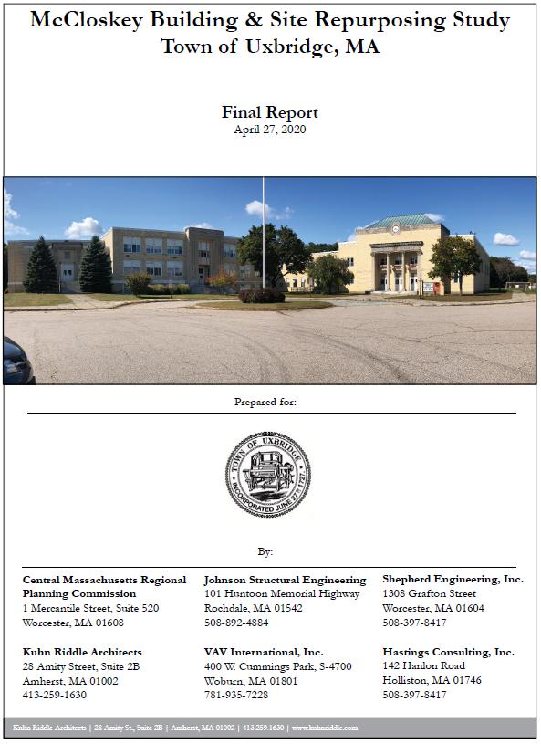 The Central Massachusetts Regional Planning Commission, in partnership with Kuhn Riddle Architects, was retained by the Town of Uxbridge to prepare a Property Condition Assessment and Site Repurposing Study for the McCloskey Building in response to the Request for Proposal UMBR2019A issued in September, 2019. The team had access to existing conditions drawings that included the original 1936 structure and additions completed in 1988 and 1998.