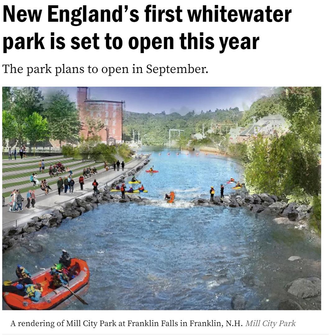 Construction begins in July on Mill City Park at Franklin Falls, billed as the first whitewater park in New England. The park plans to open in September 2021.