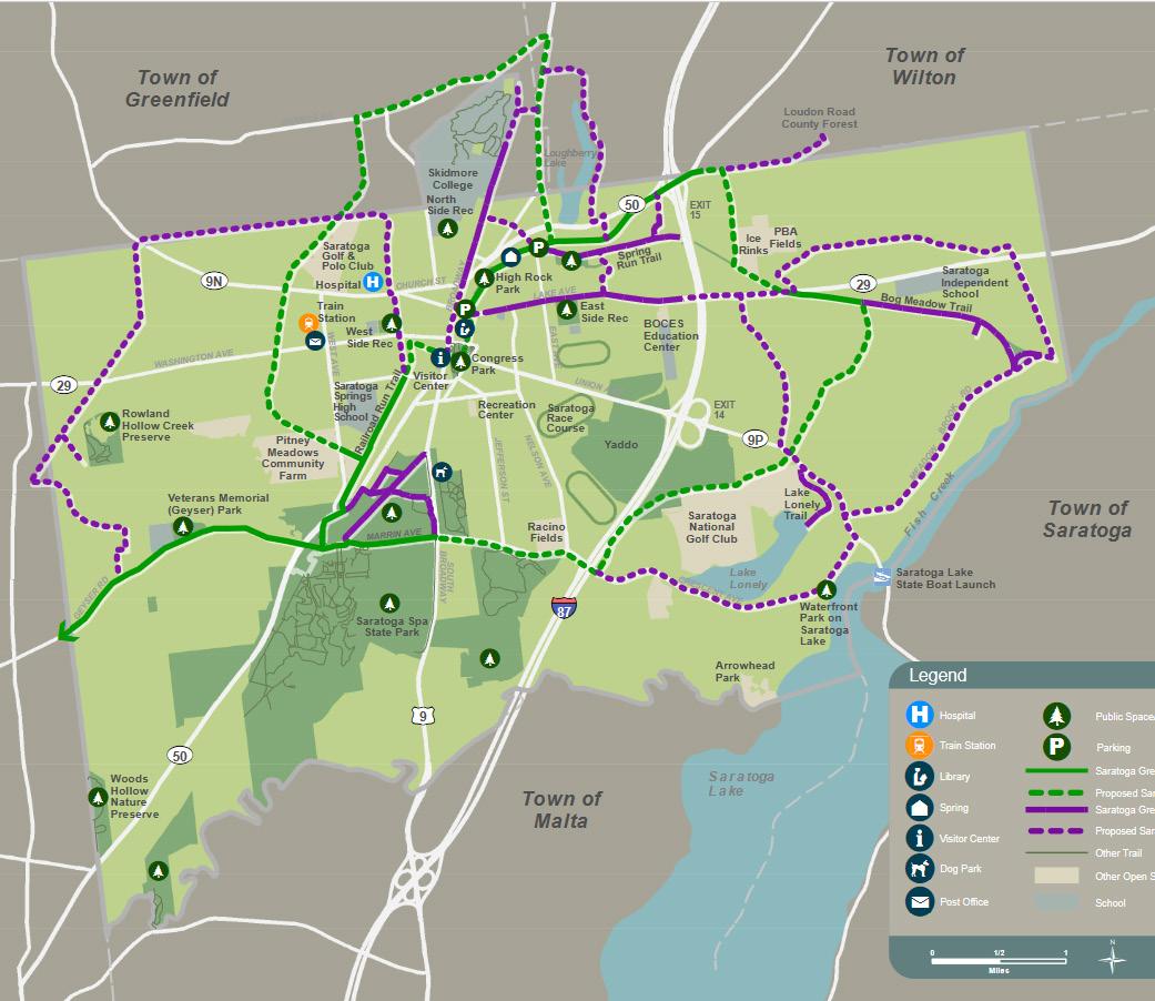 Saratoga Springs, like Uxbridge, is a community with a multitude of passive recreation opportunities and the trails associated with each. They endeavor to connect these exhibits throughout the town with a single trail, the Greenbelt. This will not only create more opportunities for passive recreation, but also make it clear to all visitorsSaratoga has a wide variety of attractions and established organizations - that there is more to see. In this way, the town is promoting an image of the city as a natural center while improving economy and environment by capitalizing on their existing natural amenities and infrastructure.
