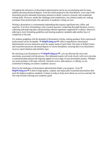 Don't let the challenges of dissertation administration hinder your progress. Trust ⇒ HelpWriting.net⇔ to deliver high-quality, original, and impeccably researched dissertations that meet the highest academic standards. Contact us today to learn more about our services and take the first step towards realizing your academic goals.