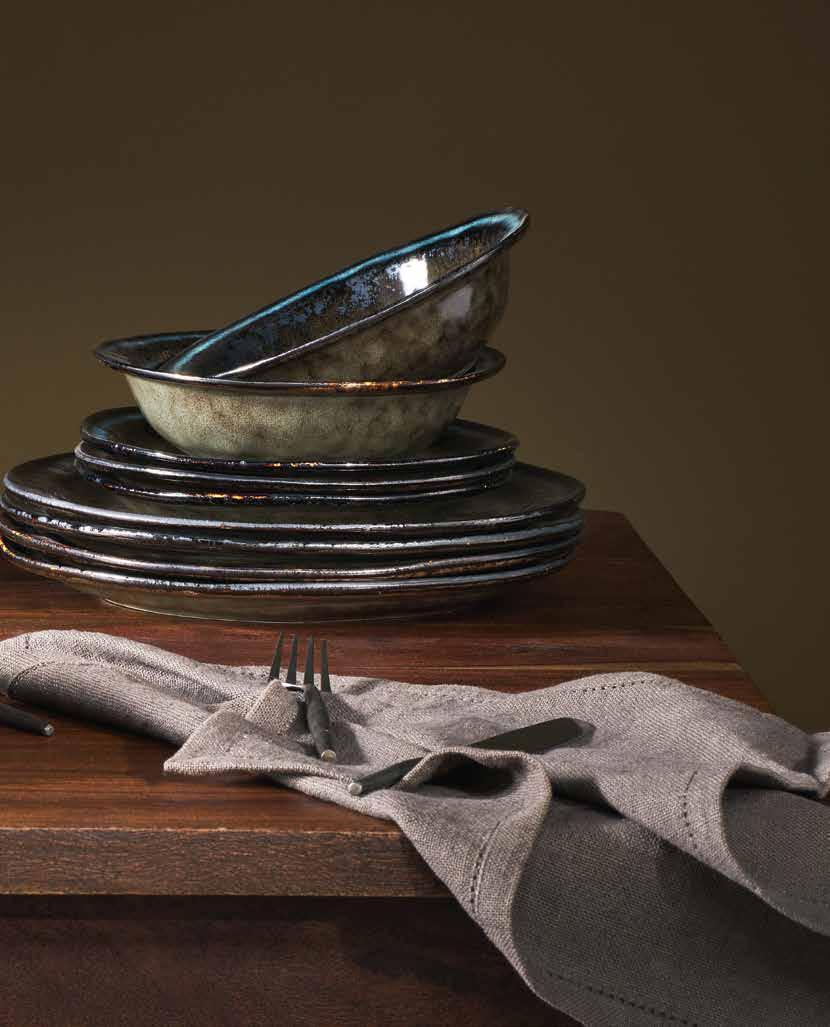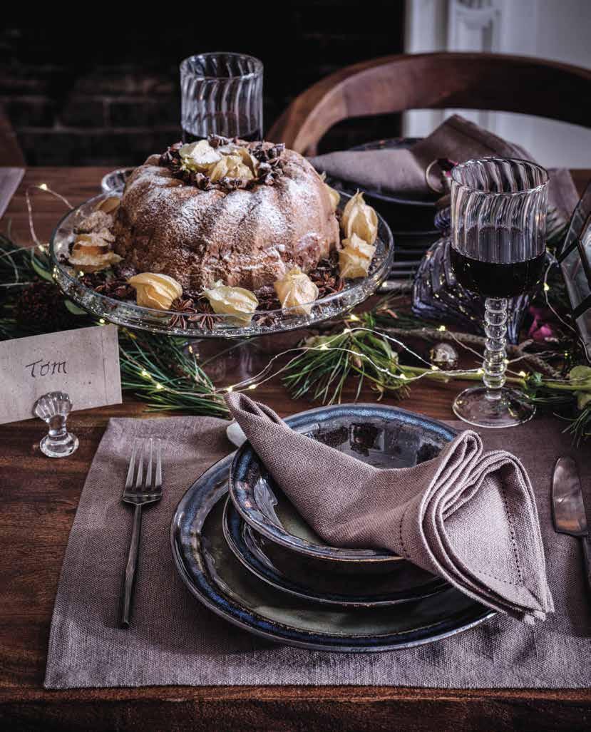 Dressed for festive feasting, our timeless table setting exudes celebratory charm and effortless style. Artisan tableware provides the backdrop to the main event, while sophisticated wine glasses and recycled glass serveware bring tactility and understated elegance. For the finishing touch, foraged foliage, brass lanterns, and Christmas decorations provide a festive flourish to delight your guests.