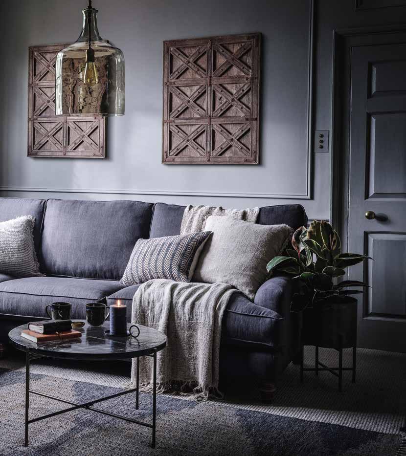 Bring comfort to an interior with a rich, dark colour palette. For effortless style, add a dark leather statement chair and pair tactile, neutral fabrics, elegant candles, and striking table lamps for a living space with a renewed sense of contemporary comfort.