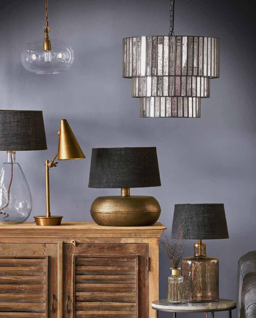 2. Otoro Recycled Glass Pendant Glass | £150.00 | Small Round 27 x 37cm (dia) 3. NEW Idhant Task Table Lamp Antique Brass | £210.00 | 60 x 18.5 x 48cm 4. Lumbu Lamp Antique Brass | £195.00 | Large 30 x 39 x 34cm 5. NEW Shanaya Mottled Glass Chandelier Antique Bronze | £650.00 | 51 x 42cm (dia) 6. Edina Recycled Glass Table Lamp Smoke Brown | £140.00 | Small 31 x 20cm (dia) 7 Dia Jute Lampshade Ink | £35.00 | Small 14.5 x 15.5/20cm (dia) | £45.00 | Medium 18.5 x 25.5/30.5cm (dia) | £55.00 | Large 21.5 x 35/40.5cm (dia) | £65.00 | Extra Large 26 x 40.5/46cm (dia)