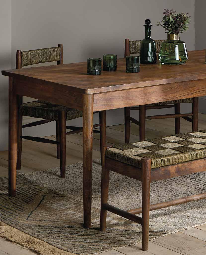 Left: 1. Mila Tumbler – Set of 4 Dark Emerald | £45.00 | 9 x 8.5cm (dia) 2. Anbu Acacia Dining Table Washed Walnut | £895.00 | Small 76 x 180 x 90cm | £995.00 | Large 76 x 220 x 90cm 3. Raunak Acacia Woven Bench Washed Walnut | £495.00 | Small 45 x 180 x 40cm | £595.00 | Large 45 x 220 x 40cm 4. Miza Glass Vase Green | £45.00 | Small 20.5 x 19cm (dia) Right: 5. Fia Dining Table Natural Natural | £1,200.00 | Small