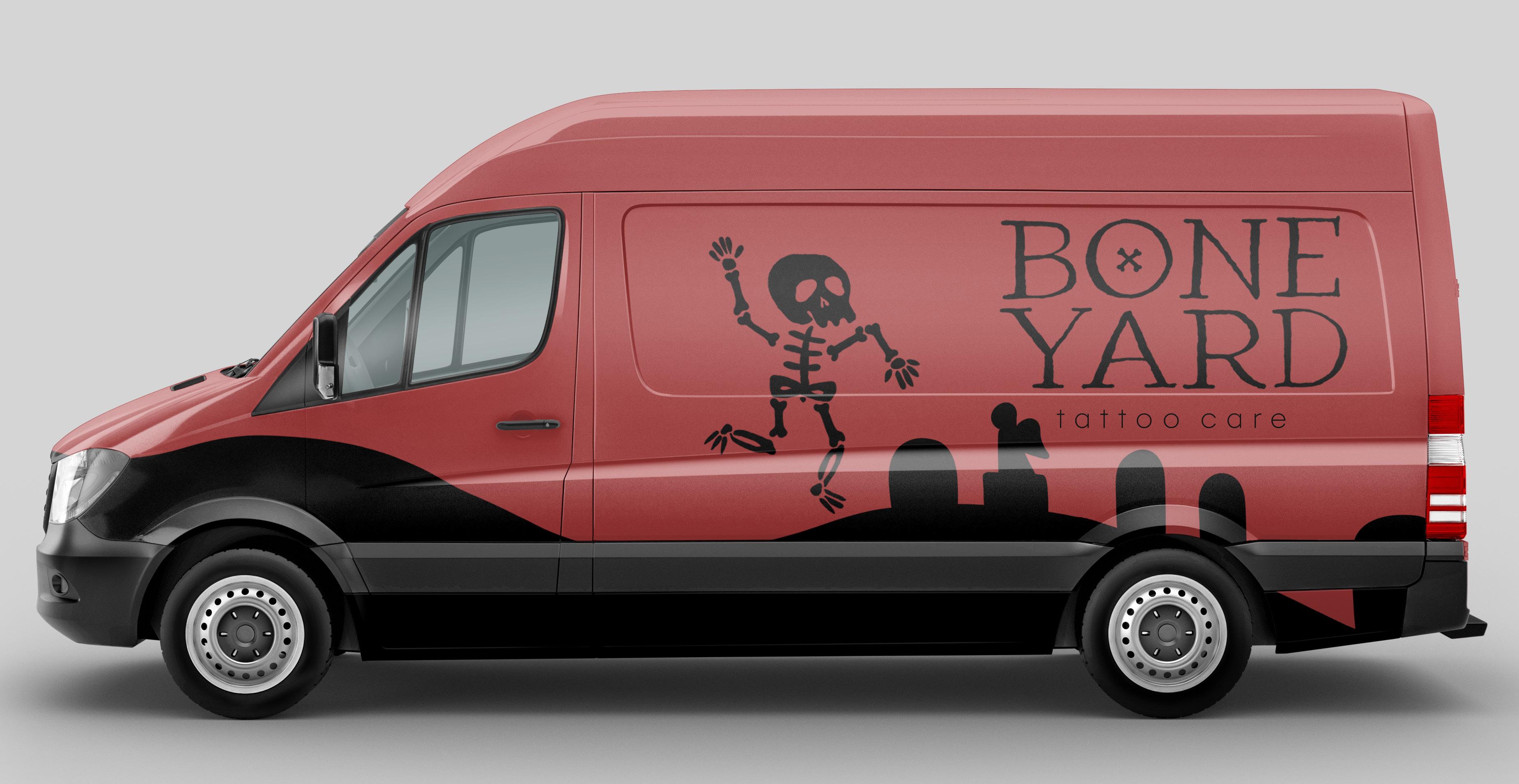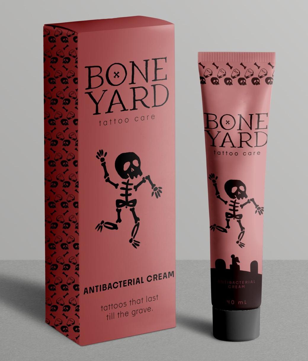 Bone Yard Tattoo Care is a fictional company offering products for tattoo enjoyers. The products needed to have flair that would appeal to a more hardcore audience, but also feels welcoming to individuals getting their first tattoo.