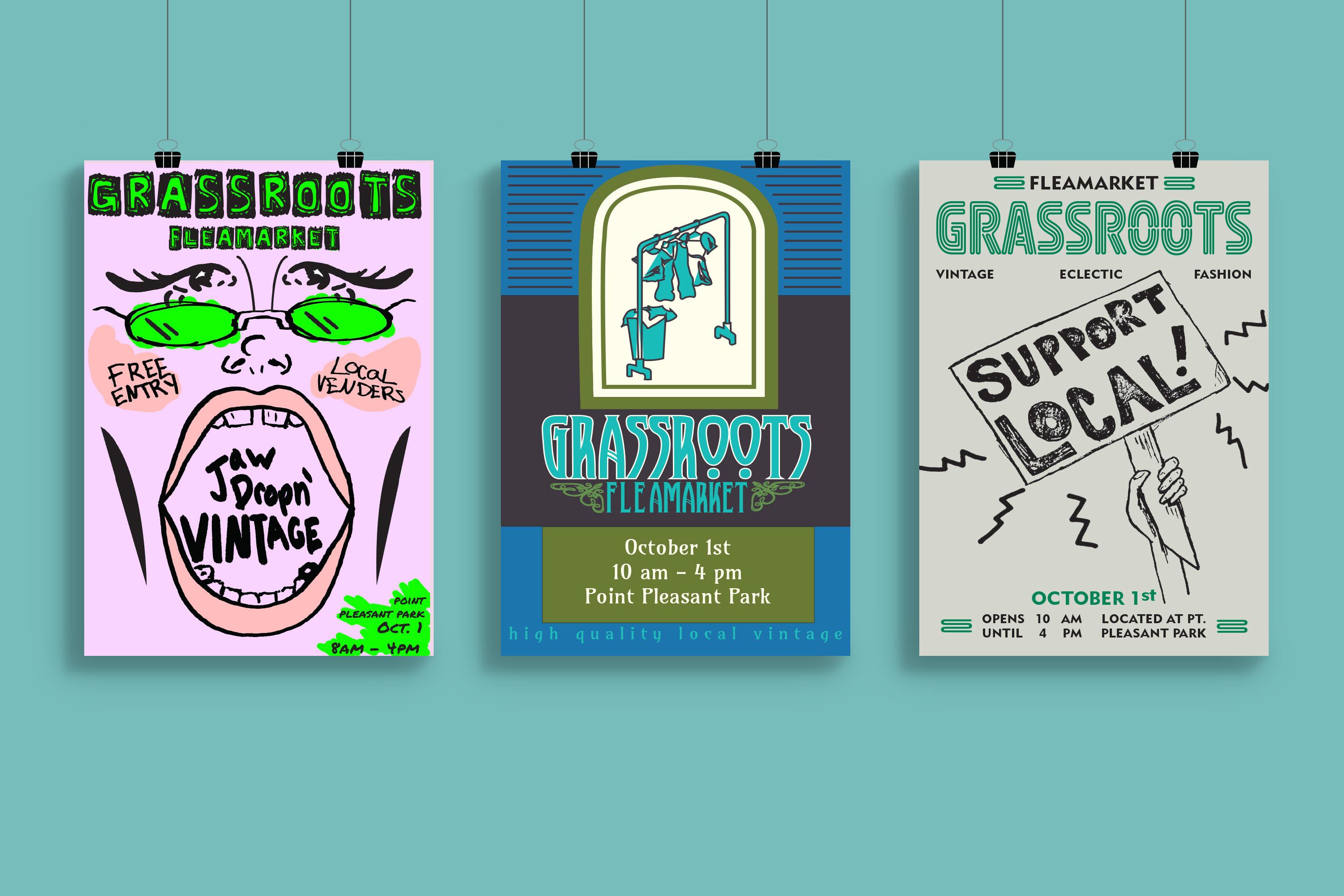 GRASSROOTS Flea Market is a fictional vintage flea market in Providence, Rhode Island. The challenge was to create wildly different posters that all advertised the same thing.