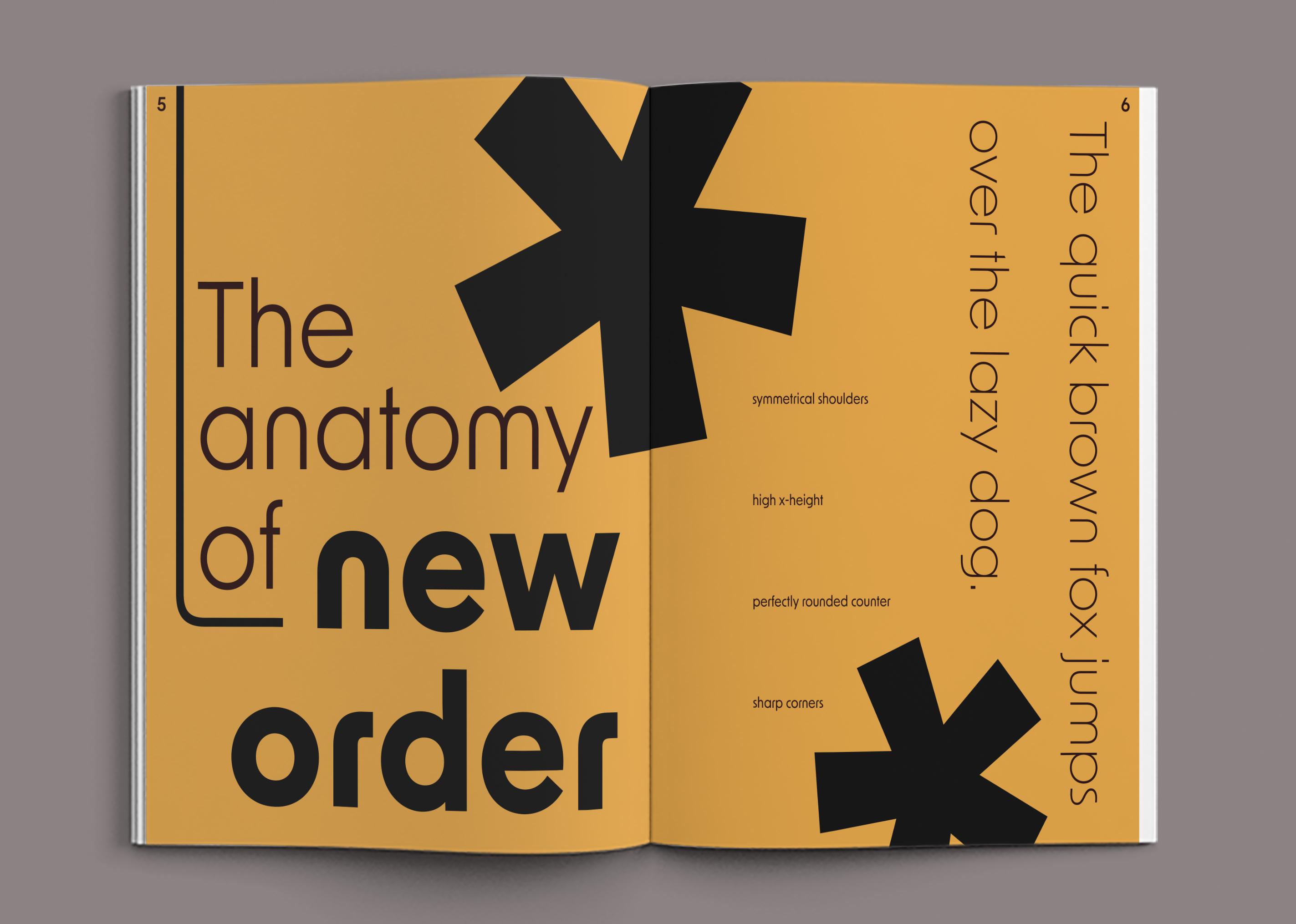I was tasked with creating a font specimen for a type family of my choice. New Order drew my attention with simple curvature and sleek look, all of which would be highlighted in the book.