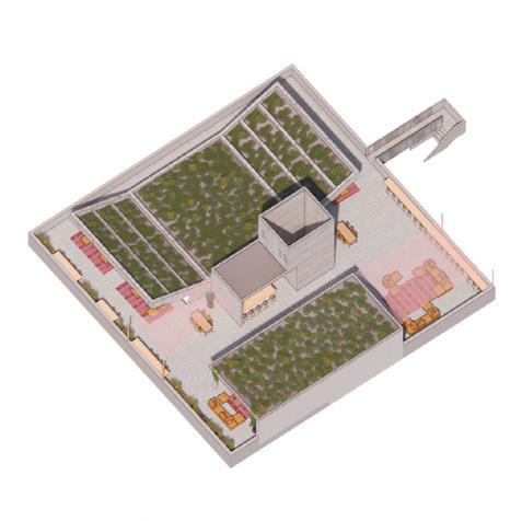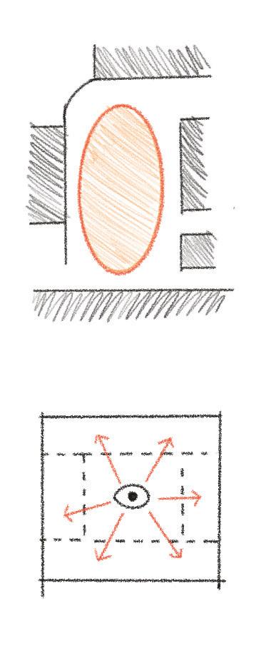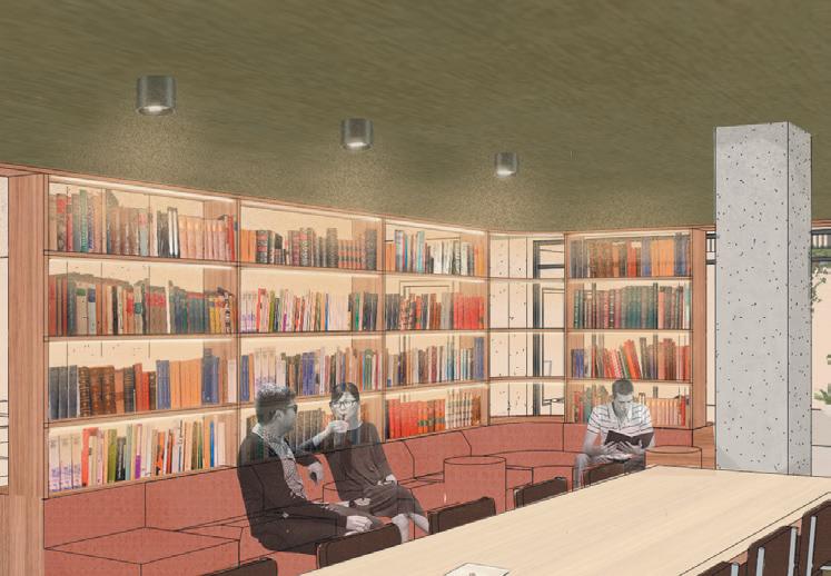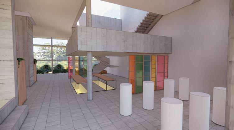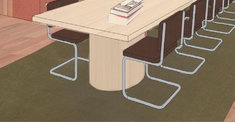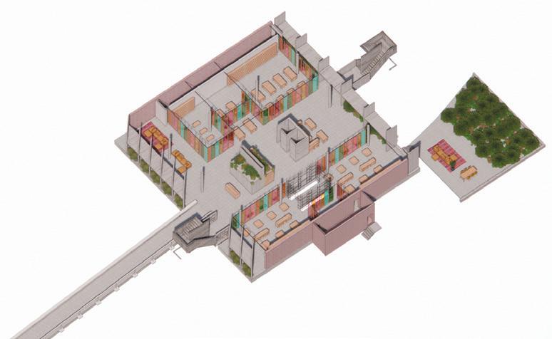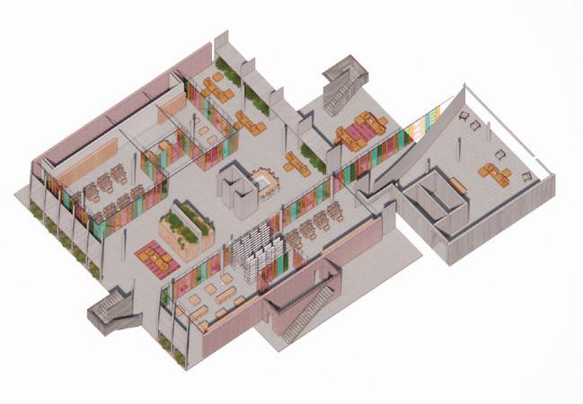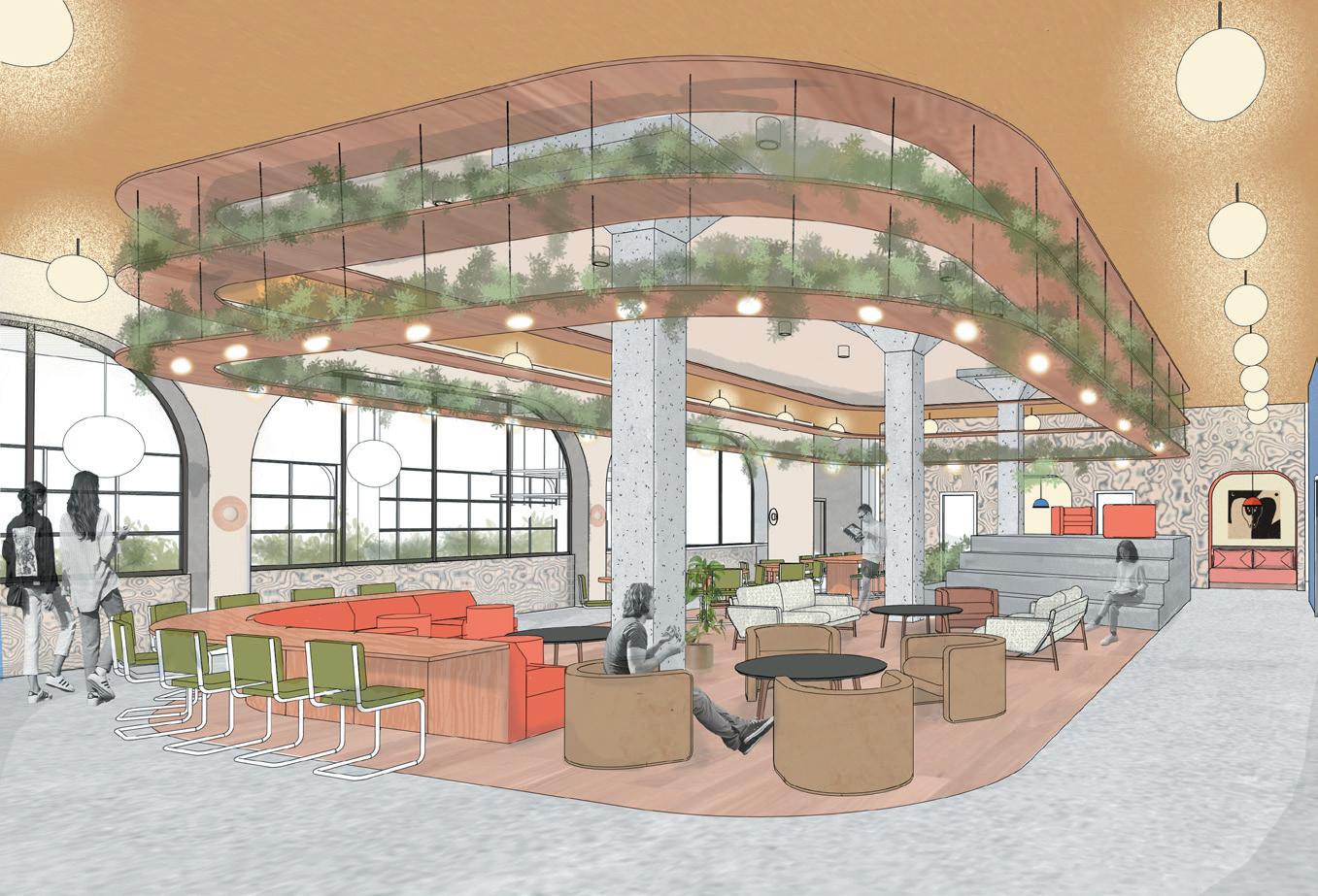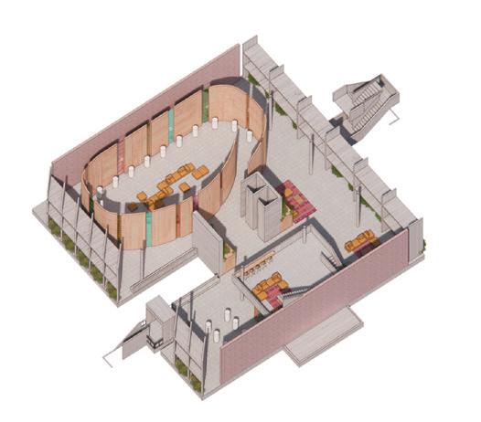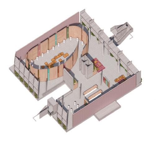 facility around nature and specifically, the feeling of being under a tree. The two organic shapes that dominate the center of the plan are shaped ‘tree trunks’ with connected ‘branches’ that would run off onto the ceiling, reaching out towards the outer edges of the building. This element builds the character of the entire facility as a natural, refreshing space, as well as creating a clear center from which every other room is unified with the connection of the branches.