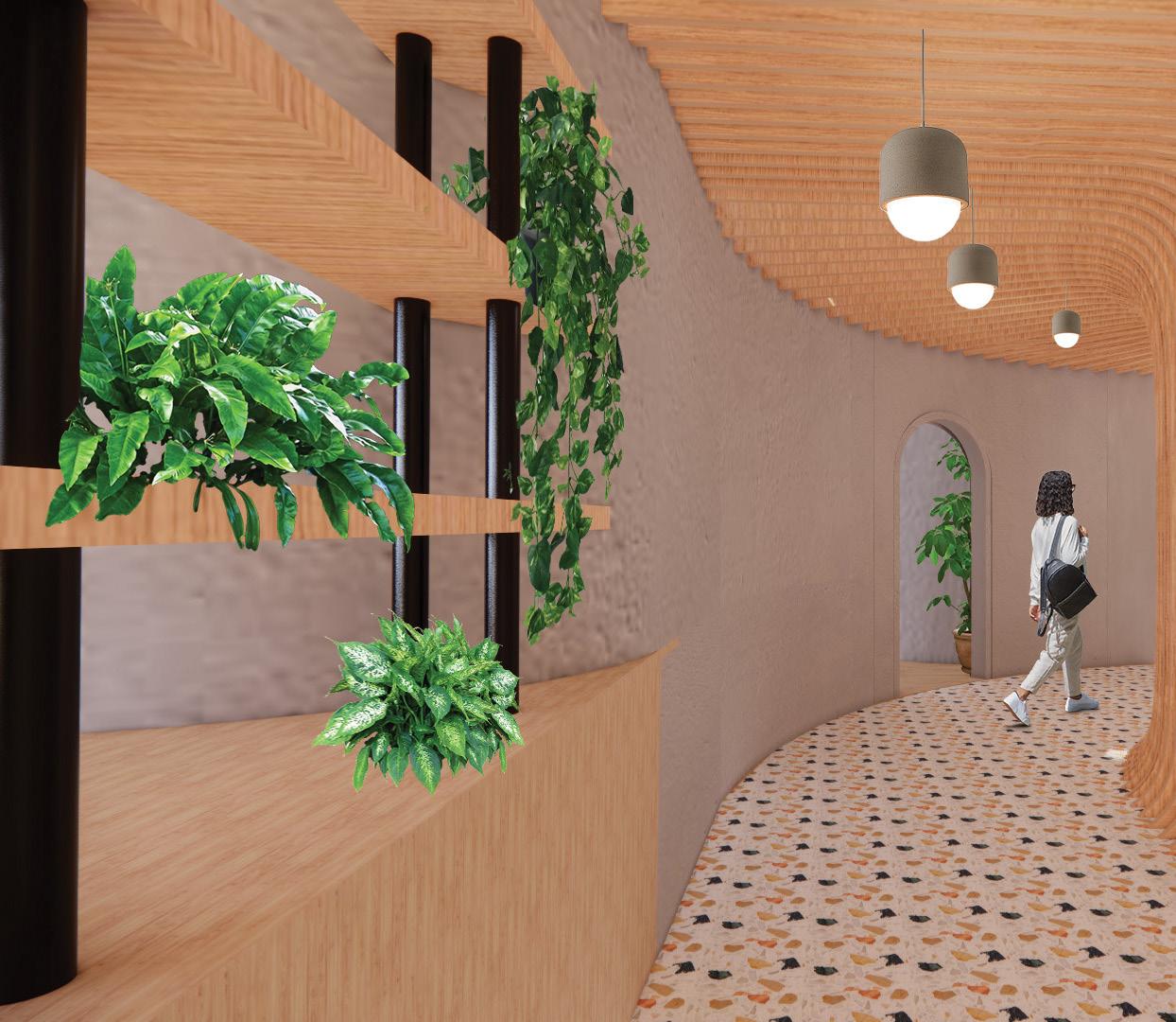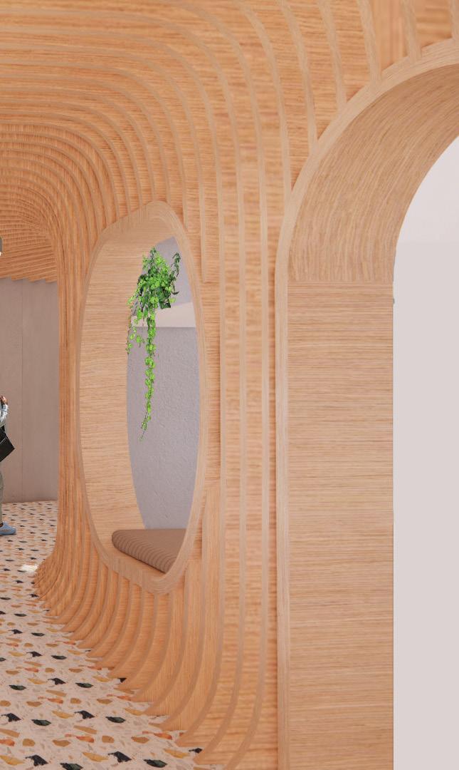 The key elements necessary for a successful and thorough biophillic design include organic forms and natural materials. I kept my material selection very minimal, letting the wood really take over the space with accents of terrazzo, concrete, and live greenery incorporated through all spaces of the facility.