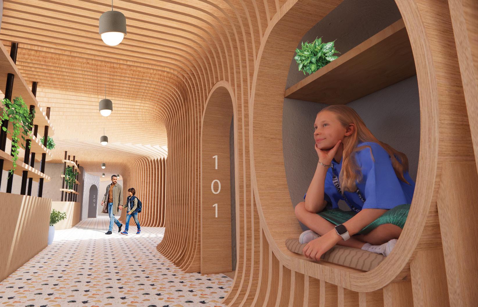 In designing this healthcare facility for children’s mental health, I wanted to embody all things biophilic. Biophilic design is the strategy of using nature and natural forms/motifs within the built environment to connect the outside world and the inside world. This way of designing is extremely beneficial to the people within the building, including both physical and mental health.