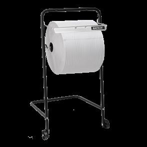 Helposti pyörillä liikuteltava metallinen teollisuuspyyheannostelija lattialle. Kaikille rullako’oille.