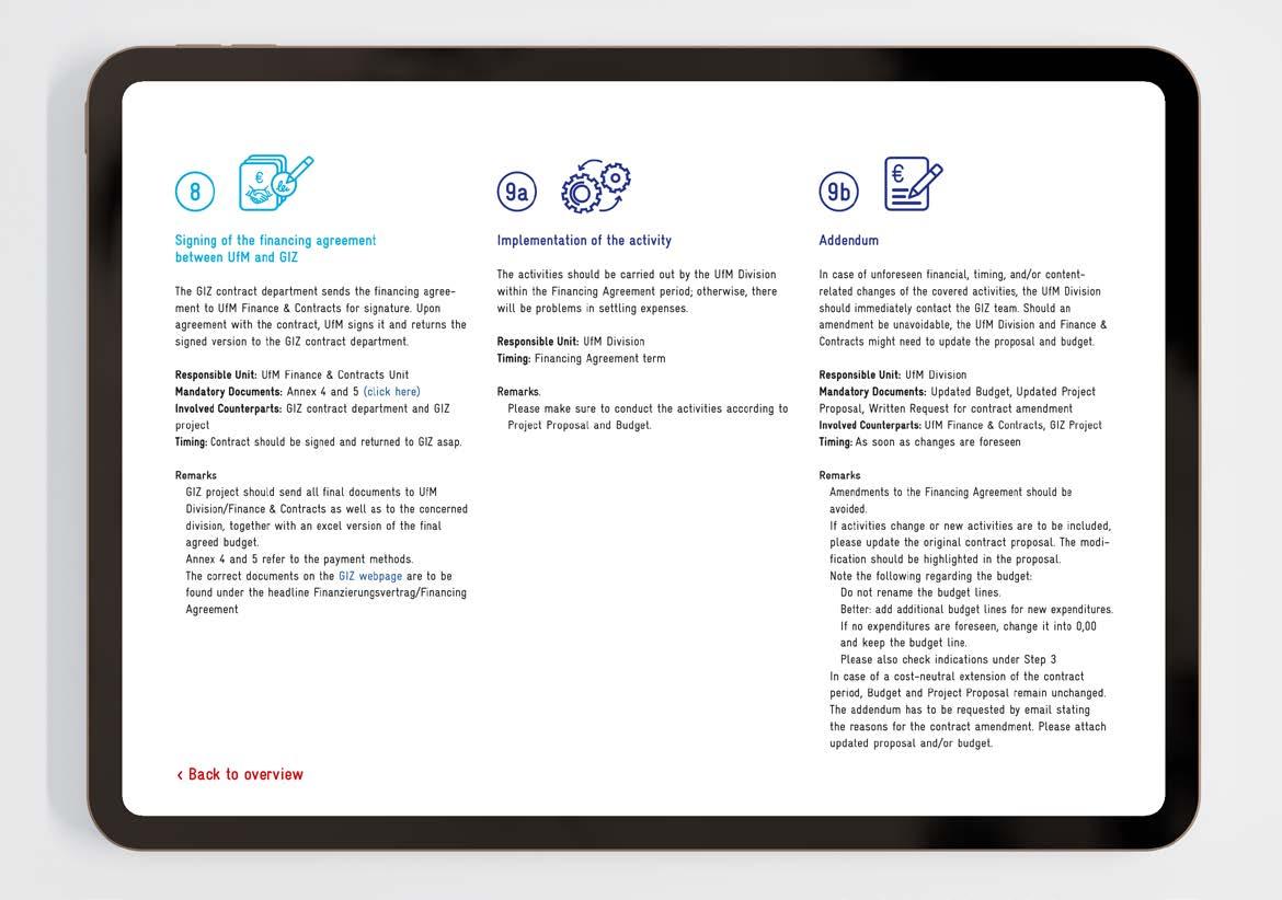 In einem Faltblatt und einer DIN-A5-Broschüre stellt sich das Institut vor. Der 68-seitige »Student Guide« wurde vor Ort von einem GIZ-Mitarbeiter mit einem Team von Studendierenden für die Erstsemester konzipiert. Der »Student Guide« soll den Frischlingen helfen, sich in der neuen Umgebung zurechtzufinden. Es gibt praktische Tipps oder auch einen Stadtplan, in dem alle für die Studierende interessanten Orte eingezeichnet sind. Für die Eröffnungsfeier des Instituts wurden RollUps und Plakate gestaltet. Diese können auch bei Konferenzen eingesetzt werden.