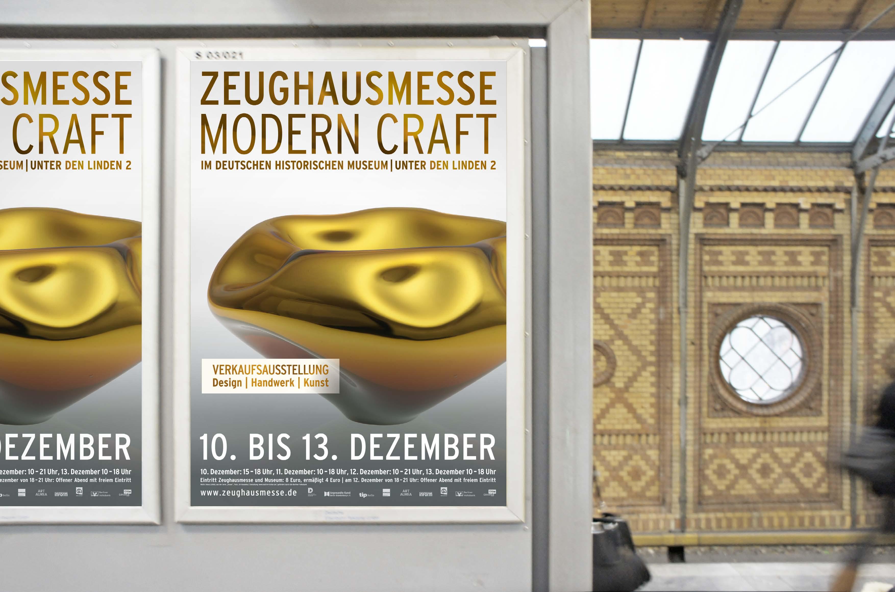Ich habe in den Anfängen der Messe ein Corporate Design entwickelt und dieses während der Zusammenarbeit kontinuierlich angepasst. Insgesamt habe ich die Gestaltung für 20 Messeauftritte übernommen. Für die Bewerbung der Messe wurde jeweils ein Motiv aus den eingereichten Fotos der Aussteller*innen ausgesucht. Neben dem Aspekt der Innovation war es ebenfalls sehr wichtig, immer wieder das Schlaglicht auf ein anderes Gewerk zu setzen (z. B. Metall, Glas, Holz, Textil, Keramik). Exemplarisch wird hier die Bewerbung von zwei Messen gezeigt.