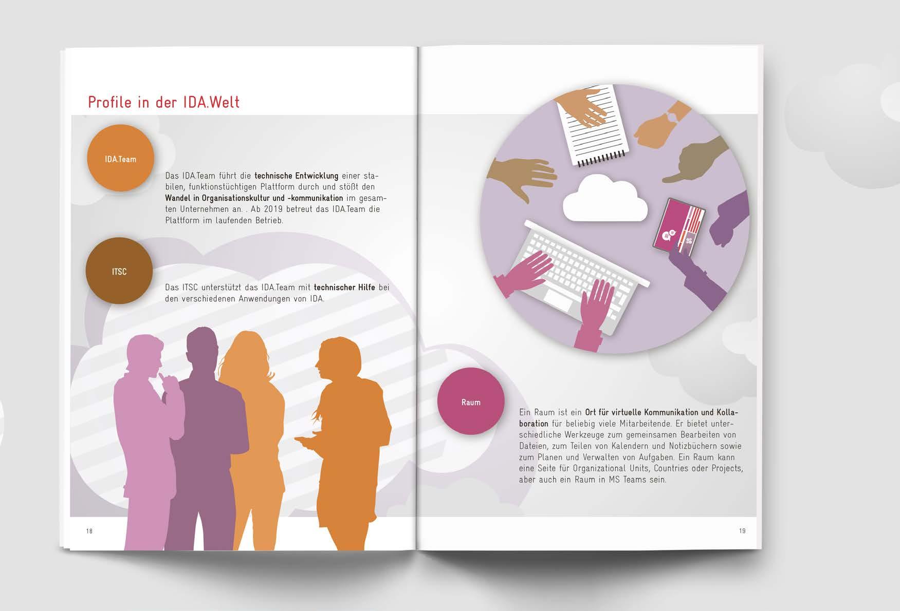 Ein weiteres Element des Keyvisuals sind transparente Kreisflächen mit Schraffur, die an das IDA-Logo erinnern. In der Broschüre sind viele Wolken zu sehen – dies ist eine Anlehnung an die cloudbasierten Anwendungen, auf denen IDA basiert ist.