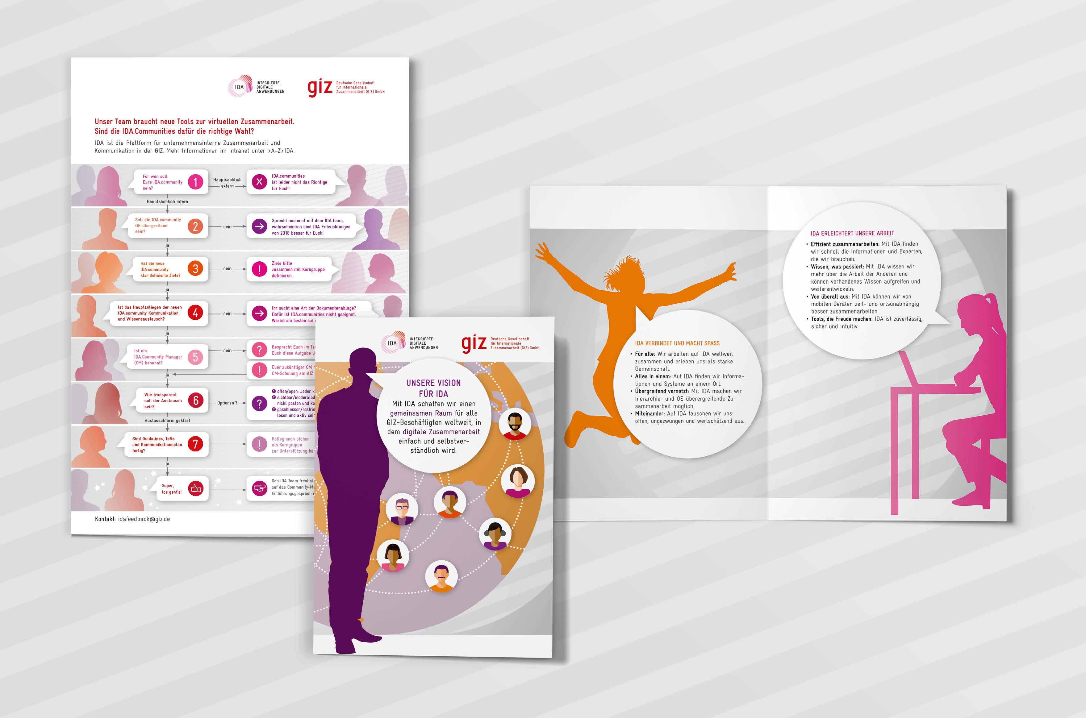 IDA soll die digitale Zusammenarbeit und Kommunikation der weltweit über 25.000 Mitarbeiter*innen der GIZ vereinfachen. Voraussetzung dafür ist, dass möglichst viele Mitarbeiter*innen den digitalen Wandel annehmen und die Anwendungen verstehen. Ich wurde mit der visuellen Gestaltung der Einführungskampagne beauftragt.