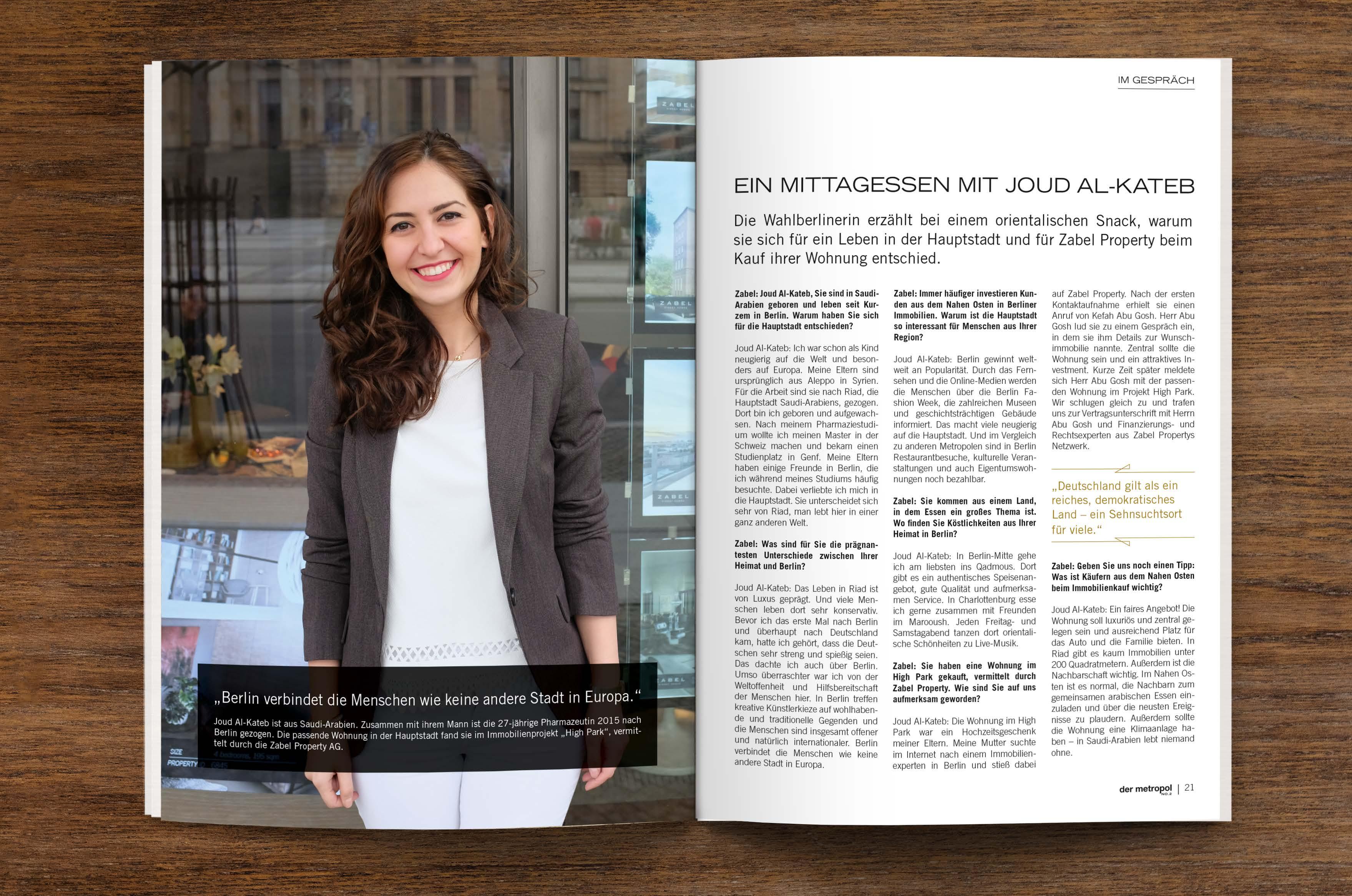 Die Zabel Property GmbH war auf die Beratung internationaler Kunden und Kundinnen zum Kauf von hochwertigen Eigentumswohnungen in Berlin spezialisiert. Um den Kundenkreis zu erweitern hatte Zabel Property den Plan, viermal im Jahr ein kostenloses Magazin mit einer Auflage von bis zu 10.000 Exemplaren herauszugeben. Es blieb bei zwei Ausgaben – die Fusion von Zabel Property mit Jones Lang LaSalle beendete das Projekt.