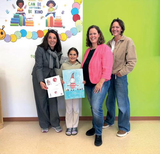 Ob es das traditionsreiche Lied „O Tannenbaum“ war, das Miray Durmaz (auf dem Foto unten 2. von links) aus der 4a zu ihrem Bild anregte? Könnte schon sein, denn ein reich geschmückter Christbaum dominiert eindeutig die Szenerie, in der neben vielen Geschenken auch noch Rudolf, das rotnasige Rentier und ein kleiner weißbärtiger Nikolaus ihren Platz fanden. Zum dritten Platz beglückwünschten Monika Lechenbauer-Thurner (links), Katrin Santer-Astl (2. von rechts) und Kunstlehrerin Daniela Jäger die kleine Künstlerin.