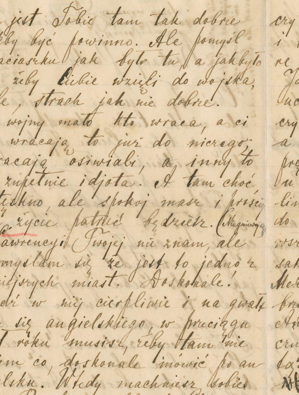 Lorenso Tavo nepažįstu, bet spėju, kad tai vienas mažesnių miestų. Puiku! Tūnok jame kantriai ir spėriai mokykis angliškai, per pusmetį, kad ir kas, turi puikiai kalbėti angliškai. Tada dumsi sau į Bostoną arba į Čikagą ar kokį kitą Niujorką ir kaupsi dolerius, o juos mes paskui eikvosime. Aš jau pradedu ta intencija mokytis angliškai ir, norom nenorom, važiuoju pas Tave, o ten Tu išmokysi mane užsidirbti vikriai ir daug, o netrukus mūsų rankose kapitalas. Kapitalą dalijame į 2 dalis, vieną siunčiame namo, o kitą kemšamės į visas kišenes ir važiuojame pirmučiausiai apžiūrėti Vidurio Amerikos, Meksikos, neliestų Amazonės miškų, Misisipės pakrančių, truputį Pietų Amerikos, o paskiau keletą mėnesių pailsėti į Australiją. Iš ten į Ceiloną ir Rytų Indiją, kuriuos negreit norėsis mums palikti, desertui liks mums Afrika, Egiptas, piramidės, sfinksai, palmės, kupranugariai, datulės, krokodilai, o paskui, broliuk, Pariečė, Ratnyčia, Ratnyčėlė, Liamoriukas, ir vėl visi kartu. Tada aš sau eremą statausi su bokštu ir langais į keturias pasaulio šalis, o Tu tuokiesi. Na ką, gerai bus? Ak, Tu Broli, Broli, norėčiau dabar Tave pamatyti, bent šiaip sau žvilgtelėti į Tavo didelę makaulę, sulaužytą nosį ir geras akis. Na, nepyk! Pas mus dabar namie didelė suirutė. Mamulė išsisuodinusi tūpčioja prie viryklės, nes rytoj Kūčios, o čia dar svečių (Mariutė, Vikčiukas su sūnumis ir Julytė) iš Vilniaus turi atvažiuoti. Juzytė ir Valė taip pat pasikaišiusios, krosnyje spraga įsiliepsnojusios sauso medžio pliauskos, Stasiukas baigė aguonas malti ir rengia kryžmas eglutei, Pietrelis kankinasi su septakordo apvertimo užduotimi, o Tėtė prisiminė dar kažkokią ponią ir nunešė jai kalėdaičių. Kas valandėlę atsiveria durys, ir su žodžiais „Tegul bus pagarbintas!“ įžengia tai senolis, tai kokios dvi mergytės, tai boba kalėdaičių. „Turbūt Ponas Vargonininkas pamiršo mus šiemet“, – sako jie ir išriša iš skepetaitės didelį vario dešimtuką. Aš čia jau 6-ą dieną, apykaklės nesidedu, nesiprausiu ir turiu slogą, žodžiu, mėgaujuosi. Slankioju iš kampo į kampą, baruosi su Mama ir Juzyte ir ničnieko daugiau neveikiu. Jadzytė turi naują pravardę Australija nuo žodžio Tralija, kitaip sakant, mažiausioji iš visų šeimos dalių. Iš pradžių ji sielojosi, bet dabar jau apsiprato, ir kai tik aš sušunku: „Australija!“, iškart ima iš kišenės degtukus ir uždega man papirosą. Degtukai dabar jos išimtinė nuosavybė, ir ji stengiasi, kad niekur ir niekas daugiau jų neturėtų. Na, štai ir priplepėjau kaip turgaus boba! Tiesą sakant, neturėčiau rašyti Tau, nes pykstu, ir atmink, kad pyktis nepraeis, kol laiško iš Tavęs negausiu. O mano adresas: Warszawa, ul. Złota, N. 25, m. 28. Na, Broli, stipriai Tave bučiuoju ir linkiu Tau visa ko geriausio, o labiausiai, kad Tavo širdyje ir sieloje būtų gera