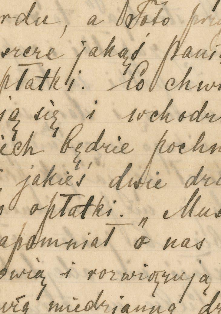 Aš savo šventes jau pradėjau: šiandien nutapiau kažką panašaus į Druskininkų ežerėlį, bet nepavyko, nes dangus išėjo kažkoks vokiškas, ir man baisiai pikta. Tačiau nepraradau vilties, kad būsimi mano tapybos darbai bus geresni. O Tu, snargly, rašyk man per šventes, tiktai daug, nes kai parvažiuosiu, gausi ausų. Aprašyk man smulkmeniškai Kūčias pas ponus Markiewiczius, kurią valandą? kas buvo? kaip atrodė? apie ką kalbėtasi? Būsiu Tau labai dėkingas, kaip ir už visus Tavo laiškus. Turiu jų net 8 ir prisipažįstu, kad dar niekas tiek ir taip dažnai man nerašė.