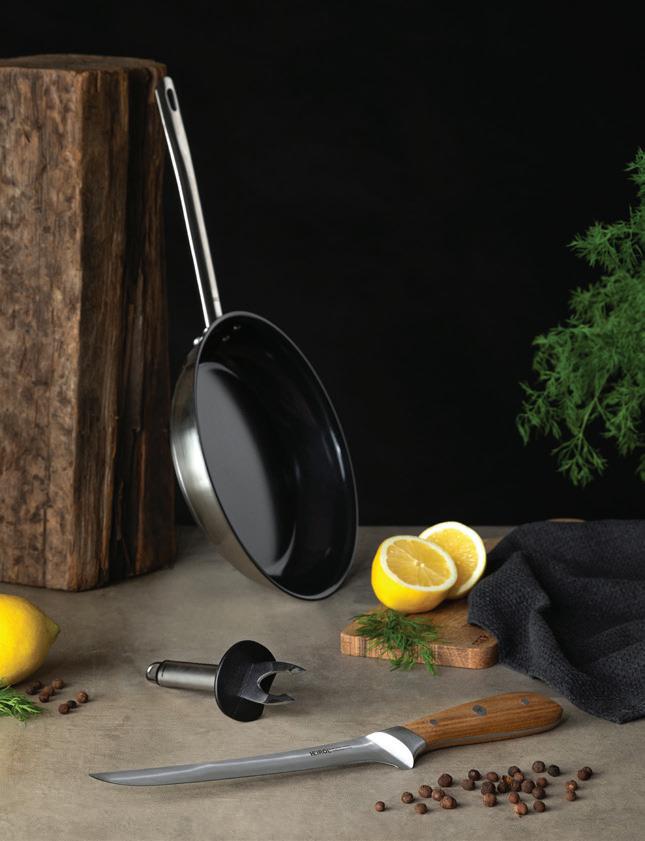 HEIROL Albera-fileointiveitsi valmistetaan korroosionkestävästä, saksalaisesta veitsiteräksestä. Saarnipuinen kahva kiinnittyy terään tukevasti niitein. Kaikille liesille, myös induktiolle soveltuvassa HEIROL Cerasafe-paistinpannussa on kolminkertainen, tarttumaton, keraamisesti vahvistettu pinnoite. HEIROL Steely-kalapiikin umpinainen, ruostumattomasta teräksestä valmistettu ja muovilla täytetty kahva varmistaa hygieenisyyden; lika ja vesi eivät pääse kahvan sisälle. Tuotteet ovat Kärkkäisen valikoimissa. Kuva: Milla Salonen.