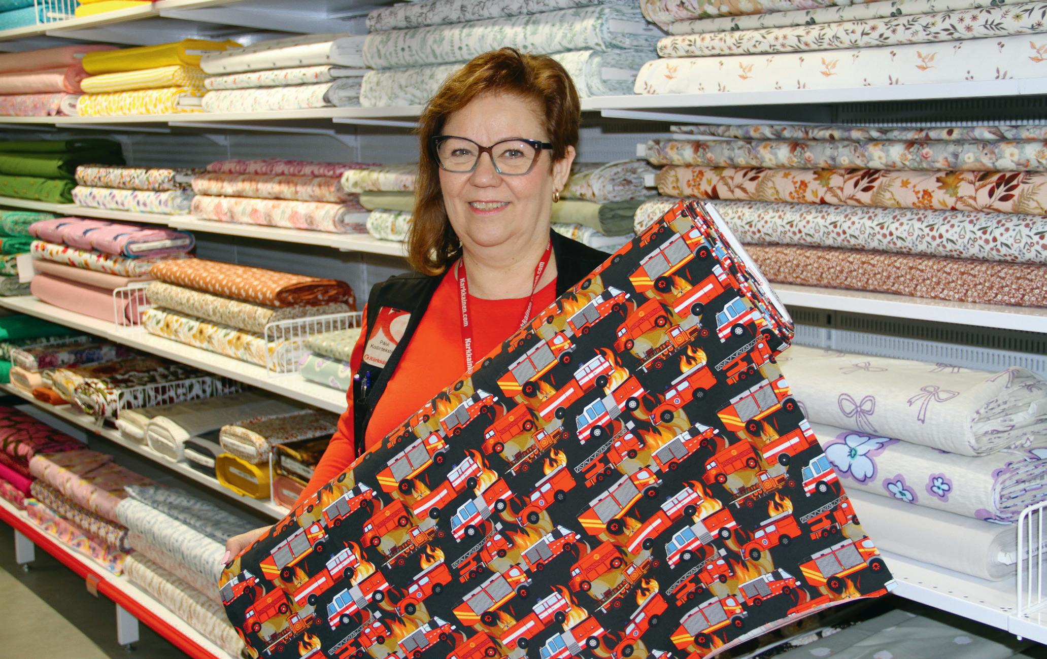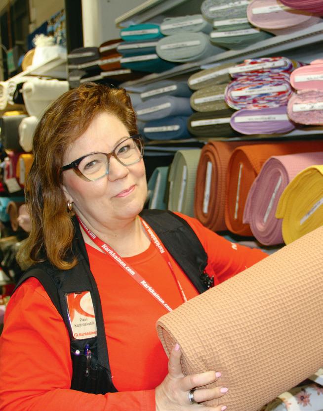 haman-pyyhkeitä. Päivi vinkkaa, että keppihevosten tekoon Kärkkäisellä on runsaasti kankaita. Samoin kasvomaskikankaita on valikoimissa. Ompelupuuhiin Kärkkäiseltä saa tuki- ja vuorikankaat, nyörit, tarrat ja pitsinauhat sekä ompelutarvikkeet. Päivillä on kotona koko ajan jonkin ompelutyö tekeillä. Koulutukseltaan hän on mallipukineiden valmistaja. •