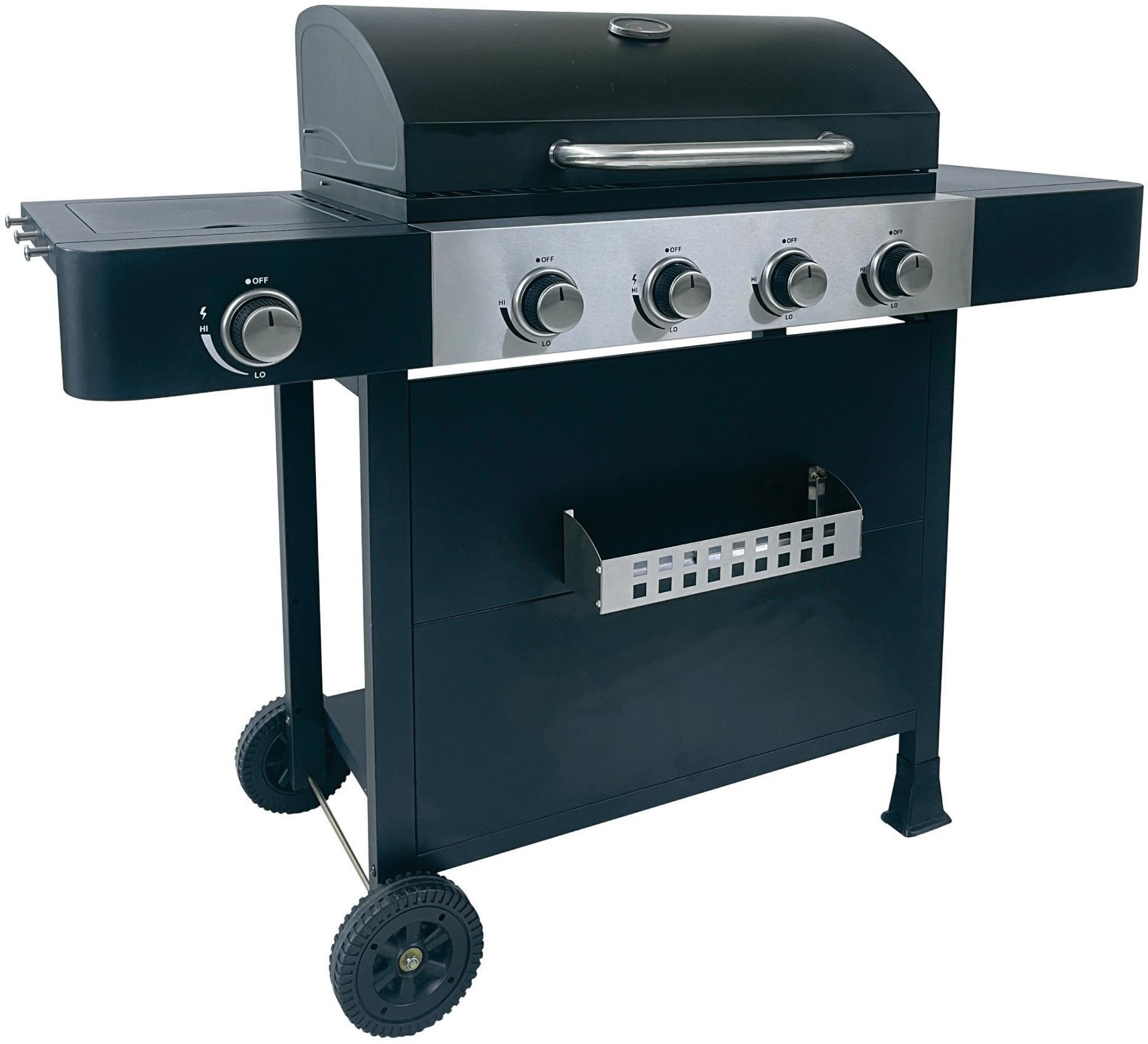 Tyylikäs 4 polttimoinen kaasugrilli sivukeittimellä. 64x35,5cm paistopinta ala jaettuna valurauta ritilän ja parilan kesken.
