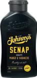 sokeri, Johnny's Makea-väkevä sinappi 20 % (sokeri, vesi, SINAPINSIEMEN etikka, suola, mausteet (mm. kaneli, korianteri), tomaattipyree, etikka, modifioitu perunatärkkelys, mausteet (mm. korianteri, valkosipuli, cayannepippuri), suola, sokerikulööri (E150c), savu-uute, säilöntäaine (E202,E211).