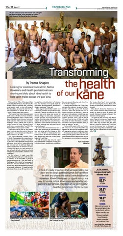 This month, the Office of Hawaiian Affairs is unveiling Känehö‘älani: Transforming the Health of Native Hawaiian Men, a decadein-the-making study on the well-being of Hawaiian käne, grounded in data from the state Department of Health and the U.S. Census Bureau, among other sources. “The Känehö‘älani Native Hawaiian men’s health report is the first-ever focus on Hawaiian men’s health that looks at medical data, physical health, chronic diseases, behavioral health and some of the more socio-economic challenges from a cultural lens to paint a clearer picture of Native Hawaiian men's health issues among our käne,” said OHA Ka Pouhana/CEO Kamana‘opono Crabbe. “That’s very crucial data for us to understand so we can meet the needs of those on the ground in our community providing those types of services,” he added. ‘Aha Käne Foundation Executive Director Keola Chan explained the comprehensive report presents data as a form of mo‘olelo. “I think it’s really important that we begin telling our story and we begin addressing that story and how we shift and shape and make a new direction for ourselves,” he said. “Känehö‘älani gives us a great mirror, in a way, to be able to look at ourselves and what is happening to our families, members of our community.” At first glance, it might seem like Känehö‘älani has little new to offer in terms of statistics. In the mid-1980s, a group of scholars presented the E Ola Mau study in Washington, D.C., which led to passage of the Native Hawaiian Health Act. Yet three decades later, the health disparities identified in that study still persist. “It would be really unfortunate for us to get 20 years down the