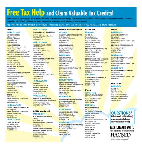 Free Statewide Tax Preparation Sites for Tax Season 2014 — Thanks to certified volunteers working at tax assistance sites across the State of Hawaii, you can have your federal and state tax returns prepared for free. Please call 2-1-1 for the site nearest you or visit our website www.hawaiitaxhelp.org for more information. ALL SITES ARE BY APPOINTMENT ONLY UNLESS OTHERWISE STATED. SITES ARE CLOSED ON ALL FEDERAL AND STATE HOLIDAYS.