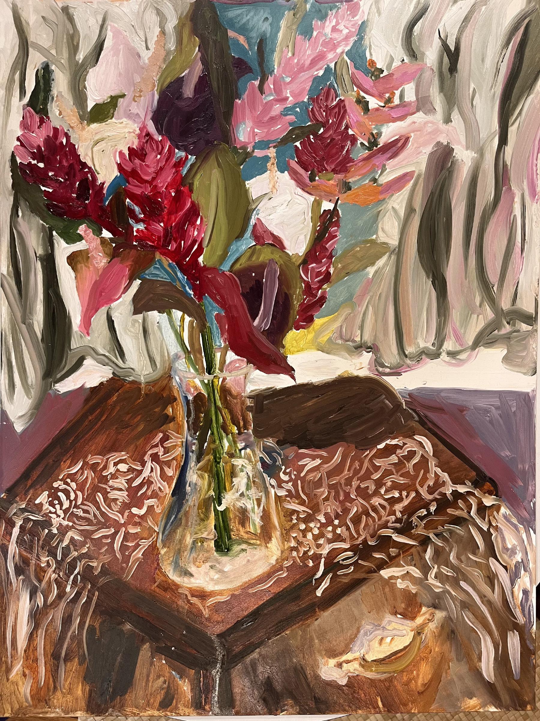 A freshly picked bouquet of colorful flowers from Nu’uanu (courtesy of Alana’s yard) captured by the up-and-coming, multi-talented pop star. This piece is on a large canvas, done with vivid oil paints, fluidity, depth, and lots of love. You’re welcome. I hope you feel the breeze, the swaying of the curtains, and smell the sweet ginger. It’s an ode to Matisse, of course, the king of flowers, vases, and painting.