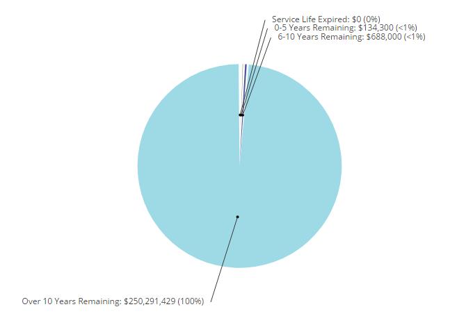 Basedon2016replacementcost,andprimarilyconditiondata,over70%ofassets,withavaluation of$1.2billion,areingoodtoverygoodcondition;18%areinpoortoverypoorcondition The municipalityhasprovidedconditioninformationfor78%ofassetsbasedon2016replacement cost.Nearly90%oftheassetsanalyzedinthisAMPhaveatleast10yearsofusefulliferemaining. However,4%,withavaluationof$69million,remaininoperationbeyondtheirestablisheduseful life.Anadditional3%willreachtheendoftheirusefullifewithinthenextfiveyears.